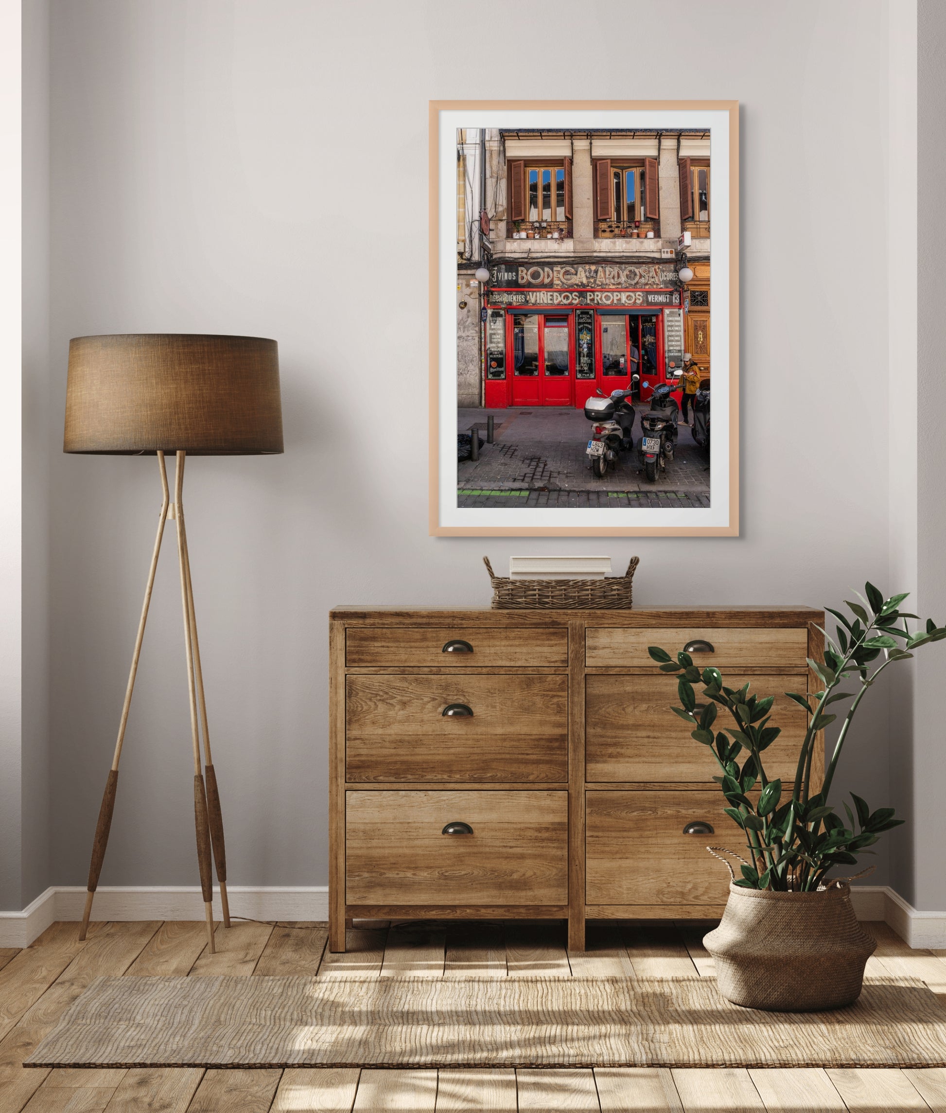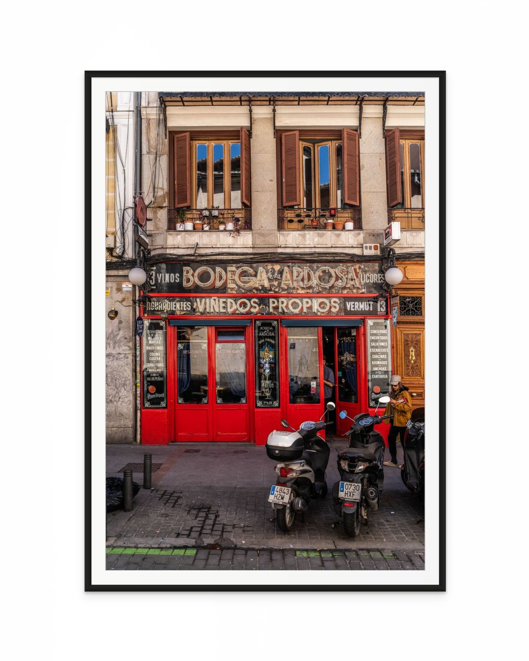 Fotografía de la emblemática Bodega de la Ardosa en Malasaña, Madrid. Un local histórico con más de un siglo de tradición, famoso por su fachada roja y su ambiente castizo. Esta imagen captura la esencia auténtica de la ciudad, perfecta para amantes de Madrid, su historia y sus tabernas de siempre. Ideal como lámina decorativa para dar carácter y personalidad a cualquier espacio.