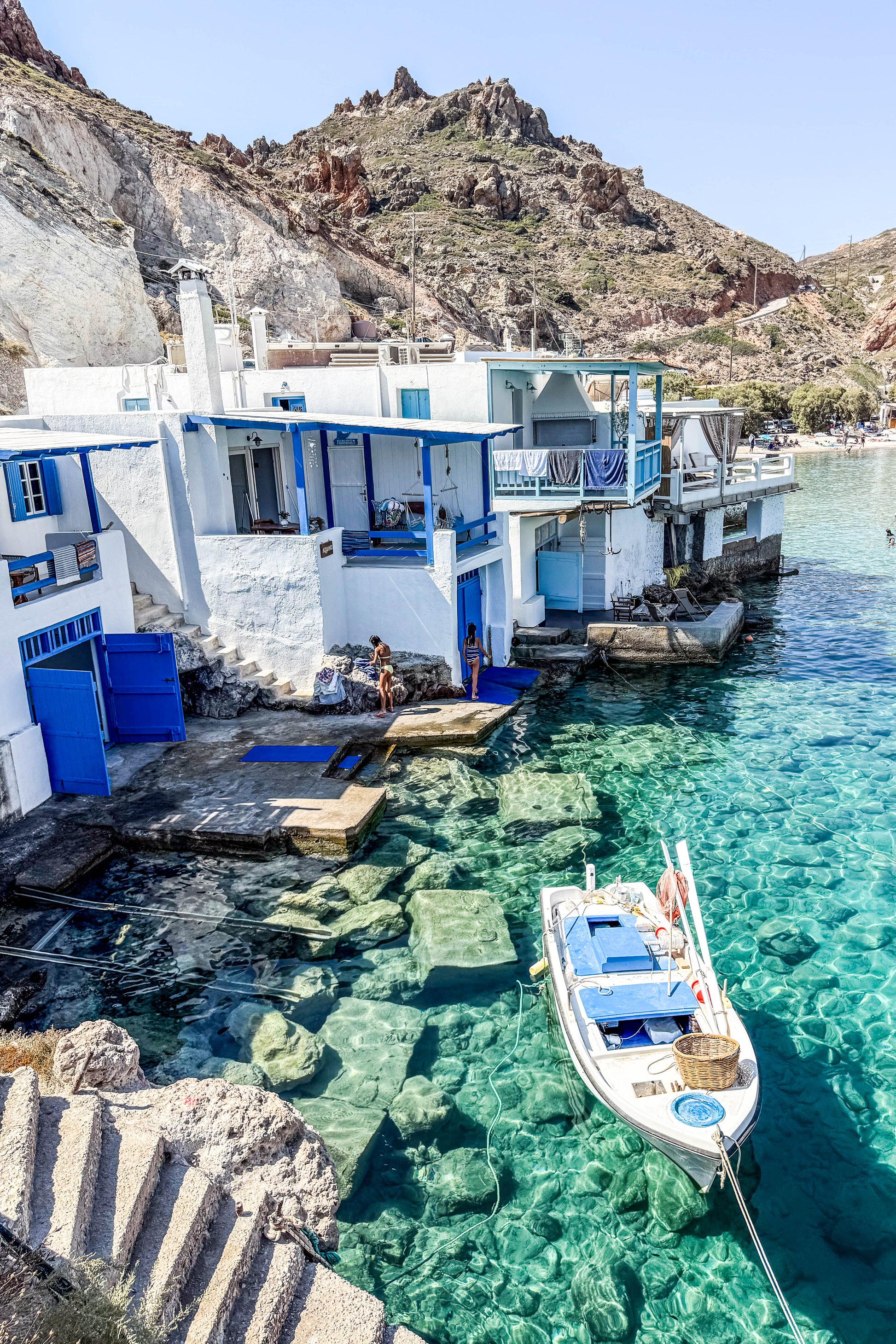 Fotografía tomada en el pintoresco pueblo pesquero de Firopotamos, en la isla de Milos, Grecia. Las casas blancas y azules junto al mar y el agua cristalina crean una escena que respira calma mediterránea y autenticidad.