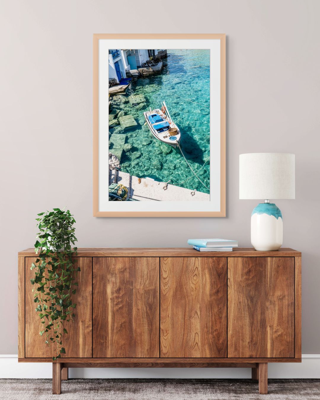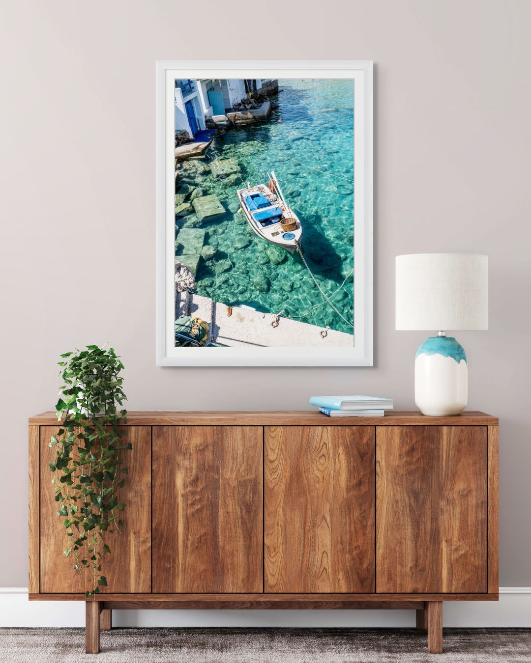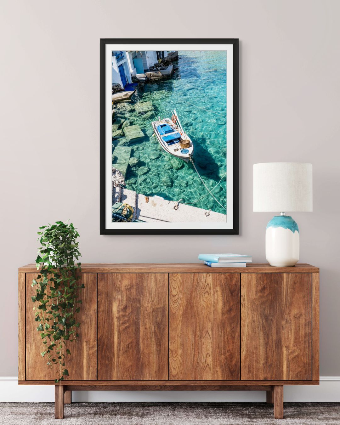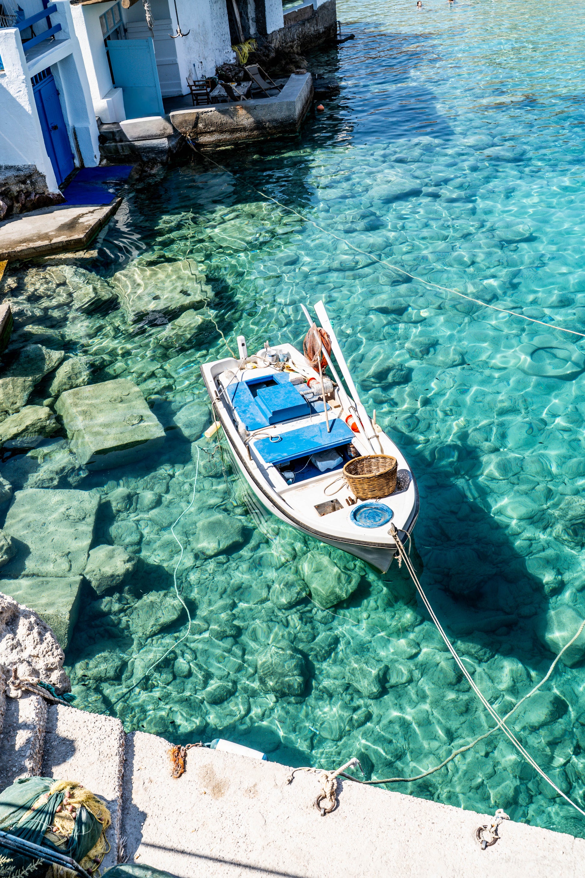 Fotografía tomada en Firopotamos, uno de los pueblos más pintorescos de la isla de Milos, Grecia. Una barca de pescadores flota serenamente sobre aguas cristalinas frente a las tradicionales casas blancas junto al mar.