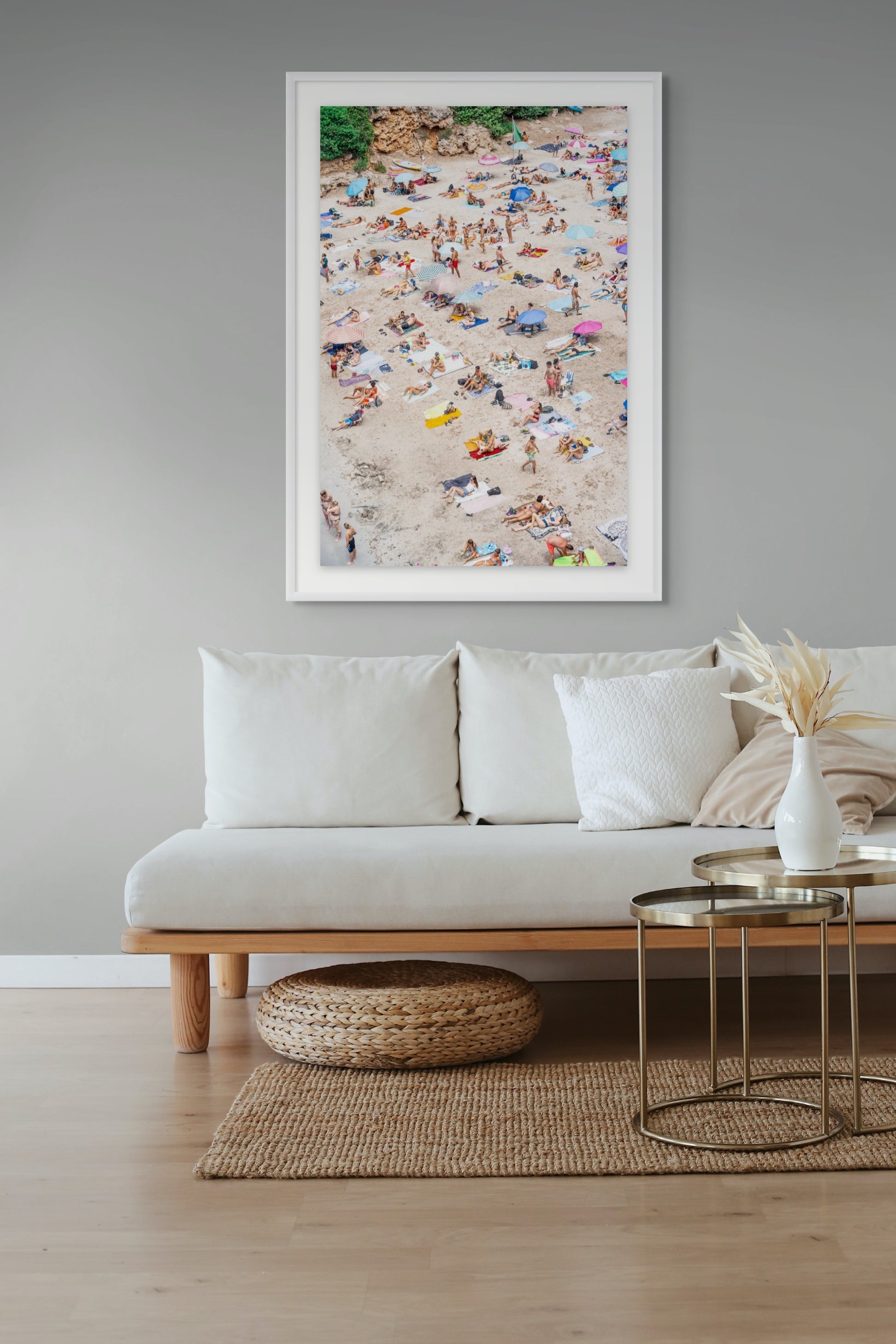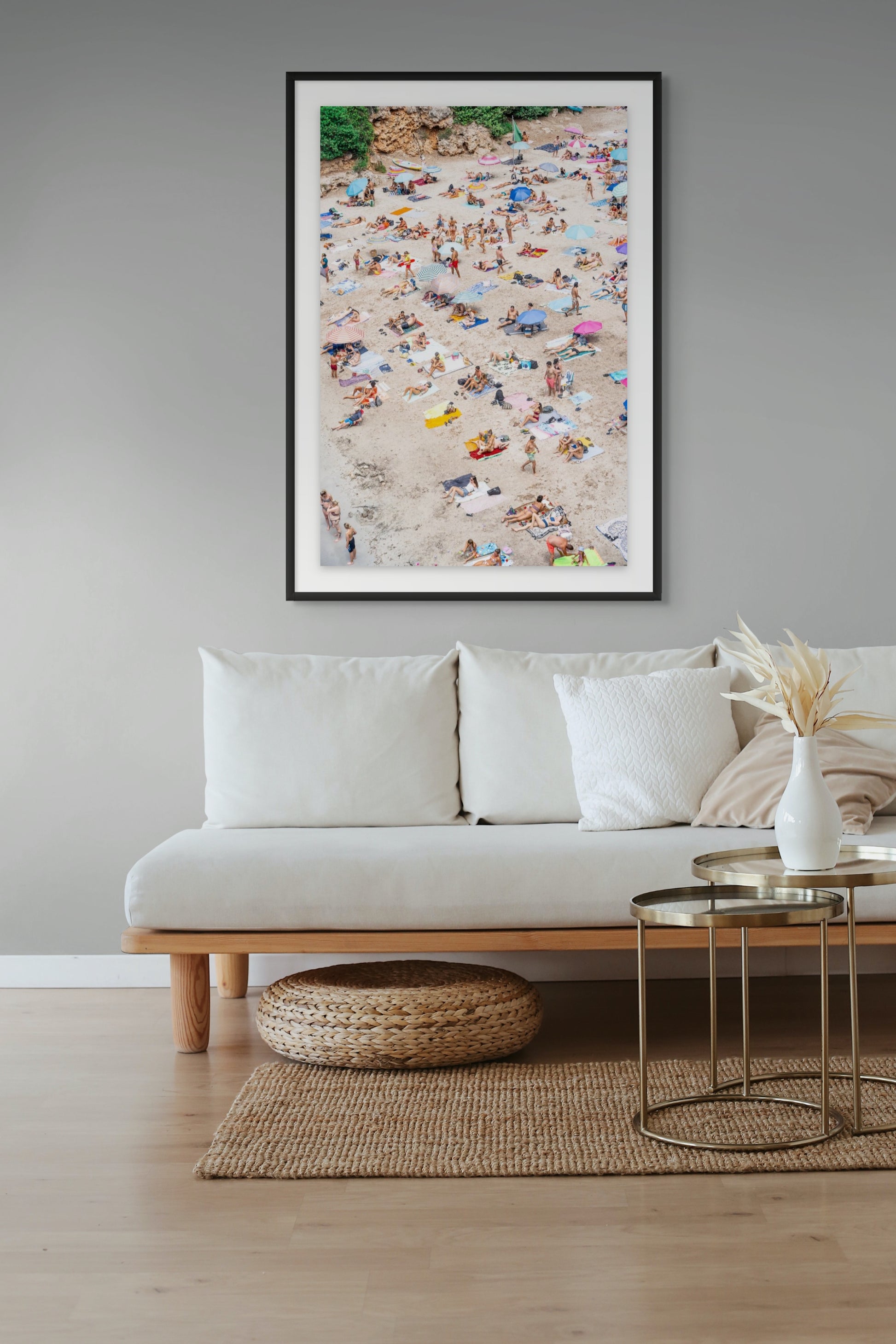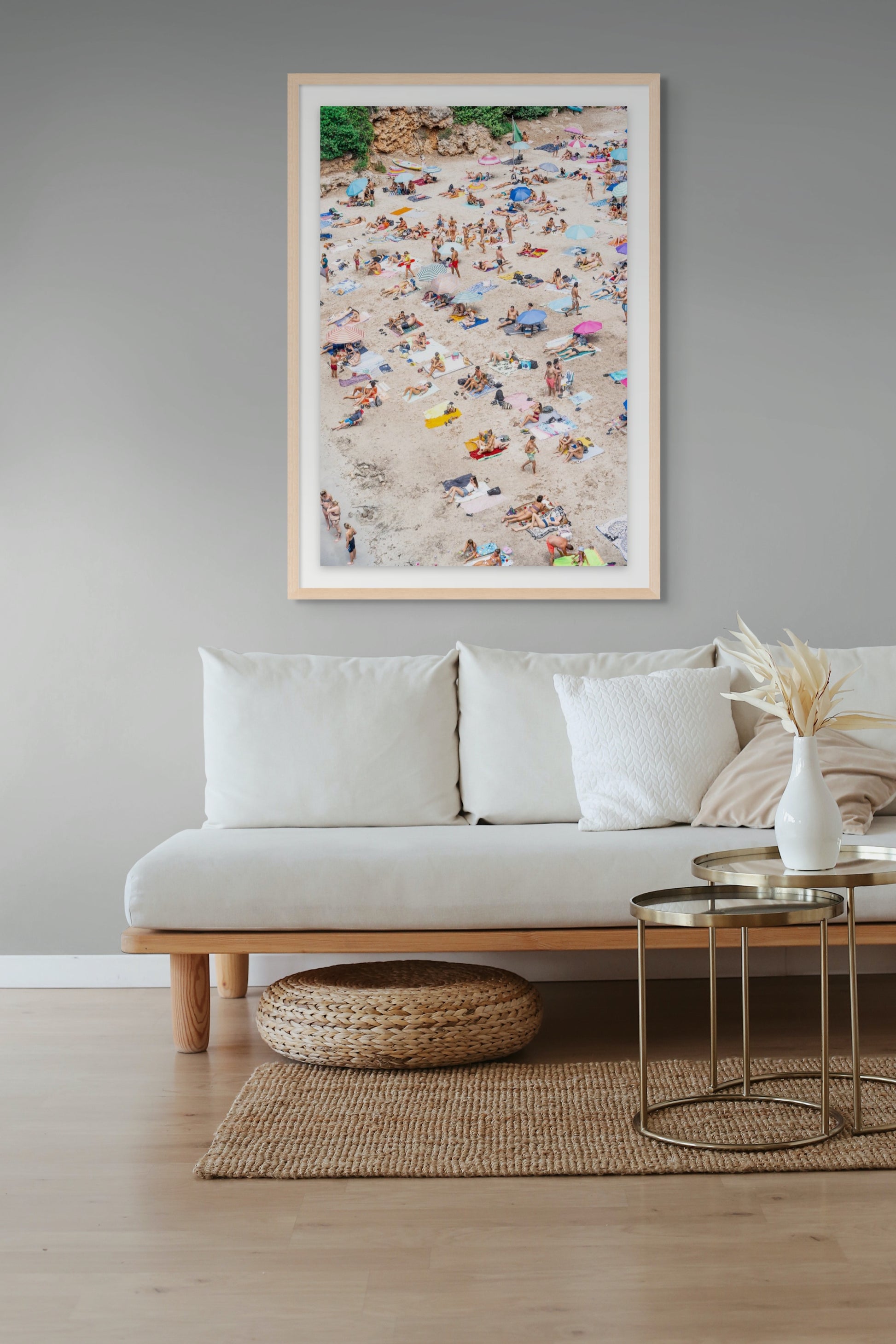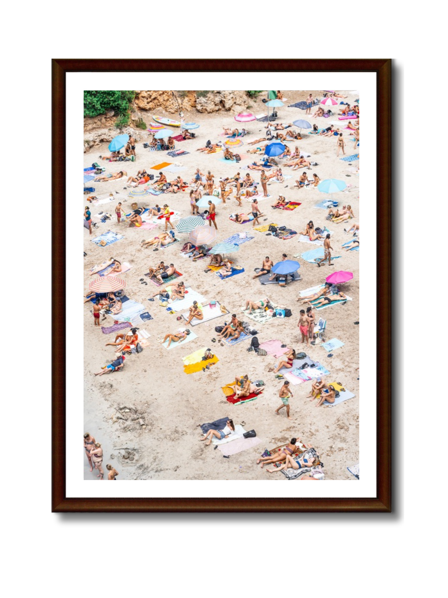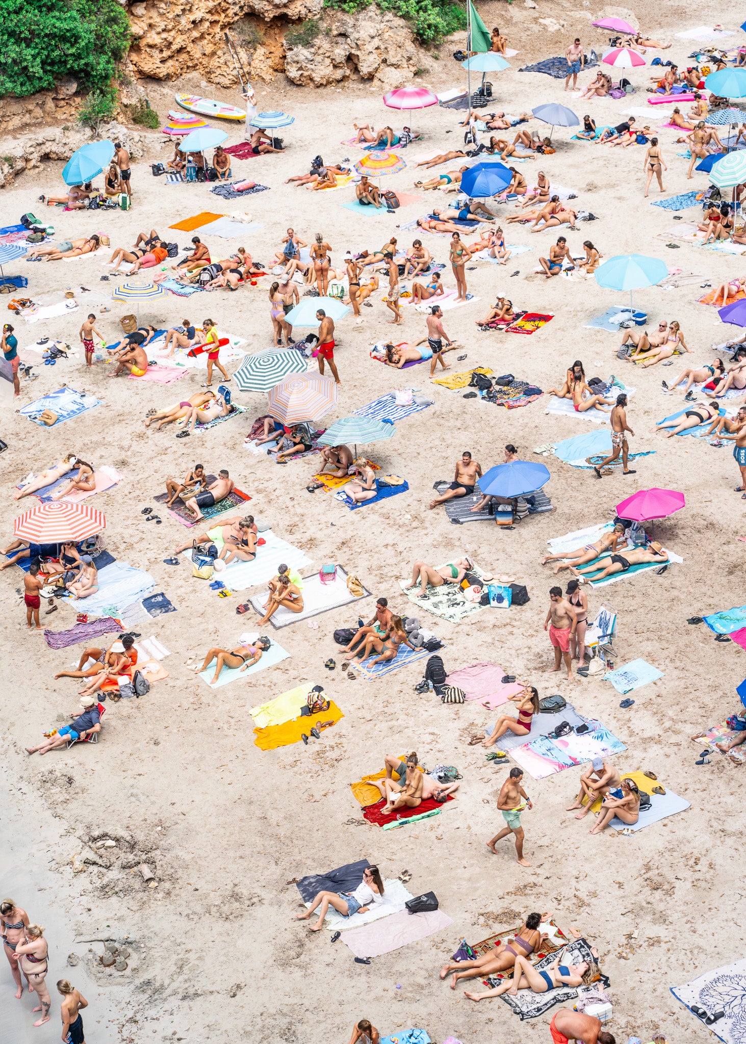 Fotografía de Cala Pi, en Mallorca, donde decenas de personas disfrutan del sol y el mar sobre la arena clara de esta cala mediterránea. Sombrillas de colores, toallas y bañistas crean un mosaico vibrante que refleja la esencia del verano en las Islas Baleares. Una imagen que transmite calor, vacaciones y la vitalidad del Mediterráneo.