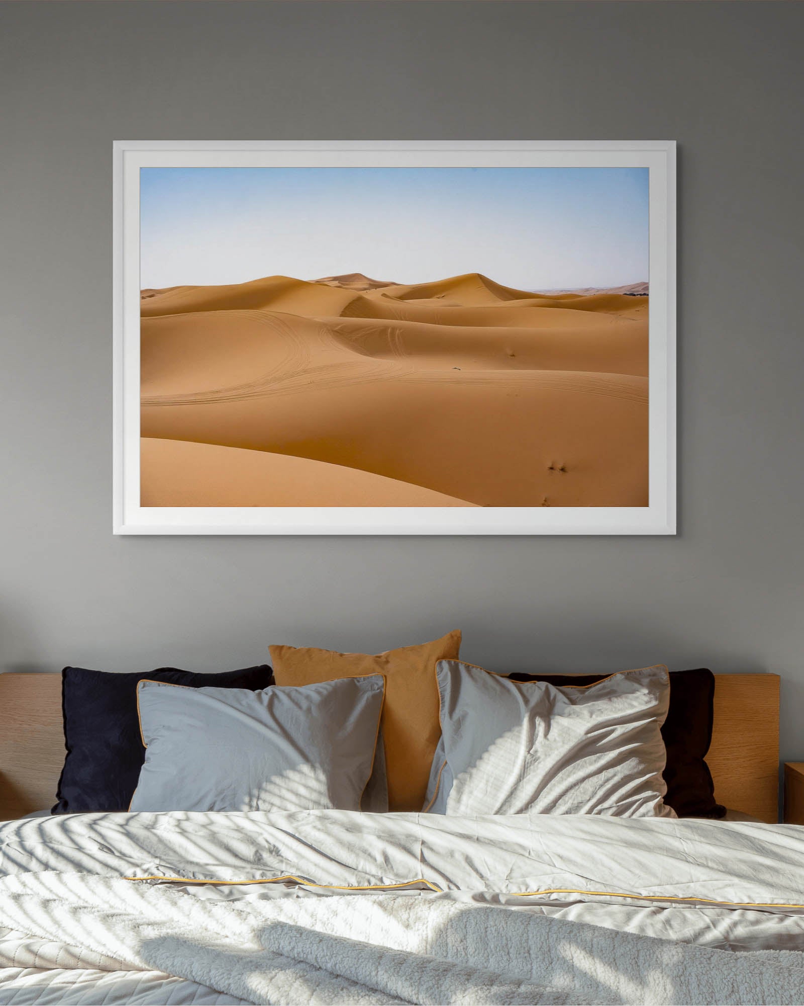 Fotografía de las dunas del desierto del Sáhara, capturadas bajo una luz suave que resalta las formas y texturas de la arena. Una imagen minimalista y envolvente que transmite silencio, inmensidad y belleza natural. Perfecta como lámina decorativa para espacios serenos y luminosos.