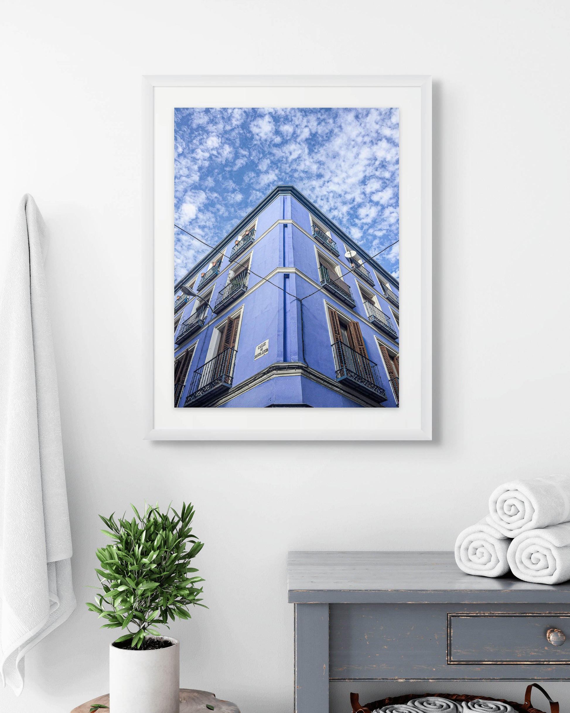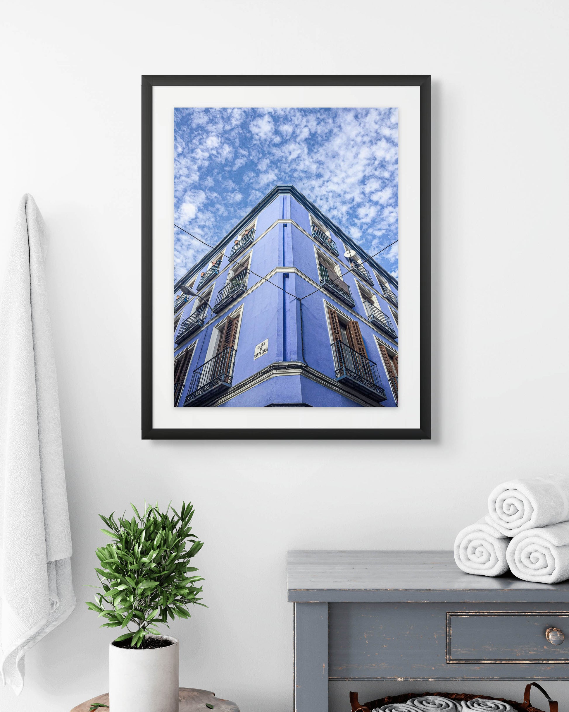 Fotografía de un edificio azul en la calle Santa Lucía, Madrid. Su arquitectura clásica destaca con fuerza gracias al intenso color de la fachada y al cielo lleno de nubes, creando una imagen vibrante y llena de carácter. Una lámina perfecta para quienes buscan decorar con escenas urbanas únicas y coloridas de la capital española.