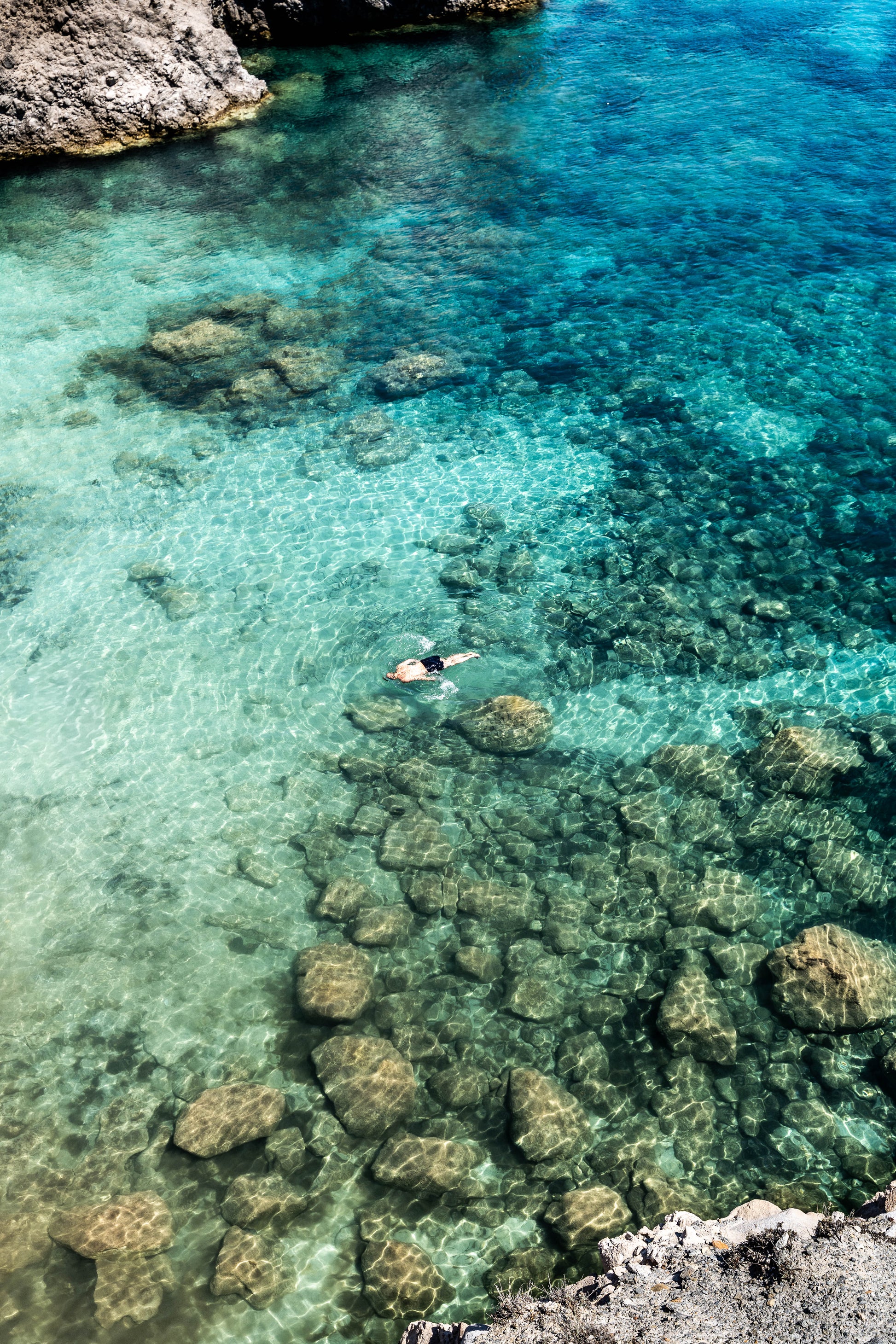Fotografía tomada en la isla de Milos, Grecia. Un hombre nada en silencio entre aguas cristalinas bajo la luz del mediodía. La calma, el azul y la sensación de verano eterno se mezclan en esta imagen que captura la esencia del Mediterráneo más puro.