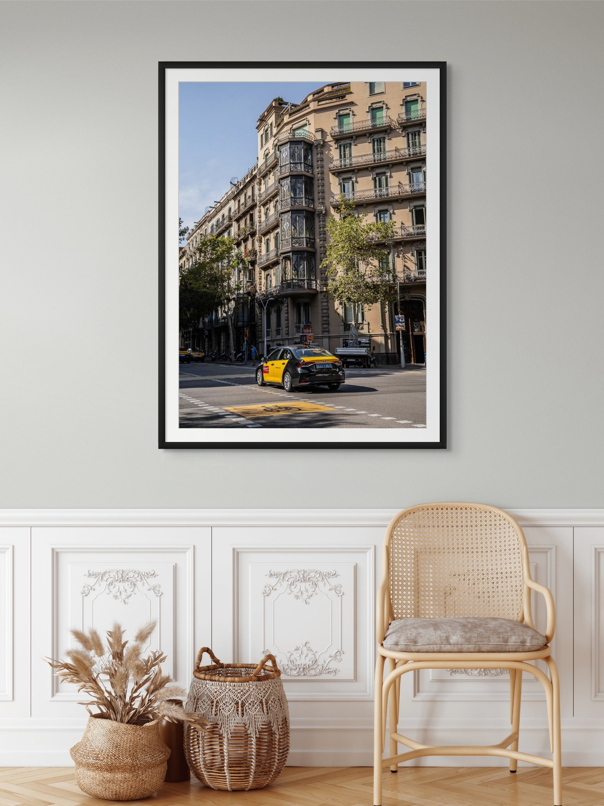 Fotografía urbana de Barcelona que combina la arquitectura modernista de la ciudad con el característico taxi amarillo y negro en primer plano. Una escena auténtica y dinámica que refleja la vida cotidiana y el estilo único de la capital catalana. Ideal para decoración contemporánea y amantes de la ciudad.