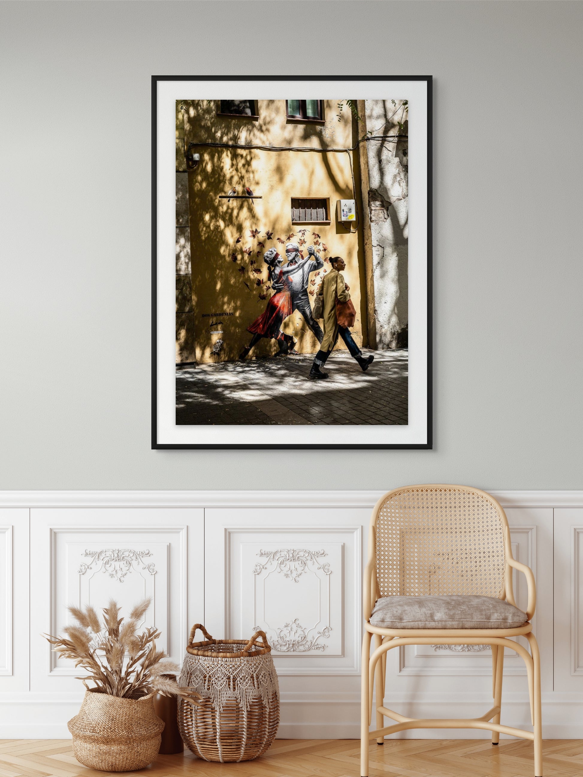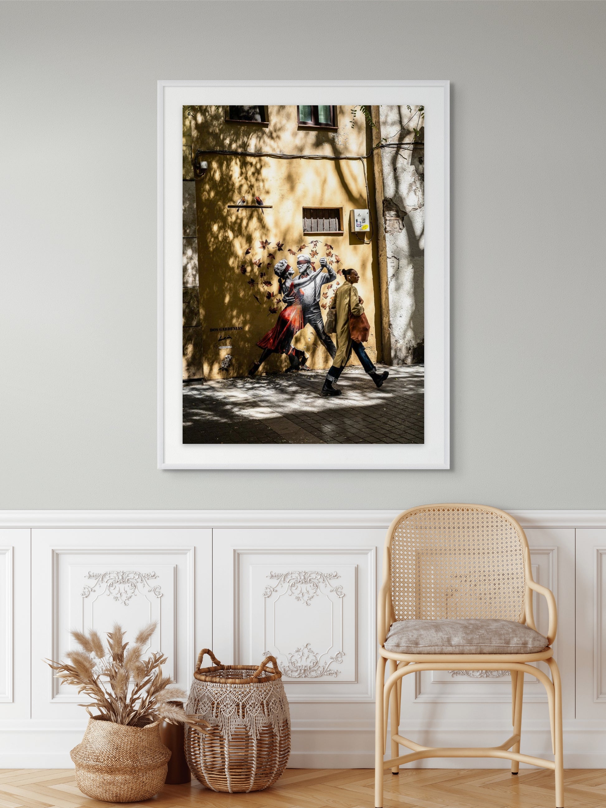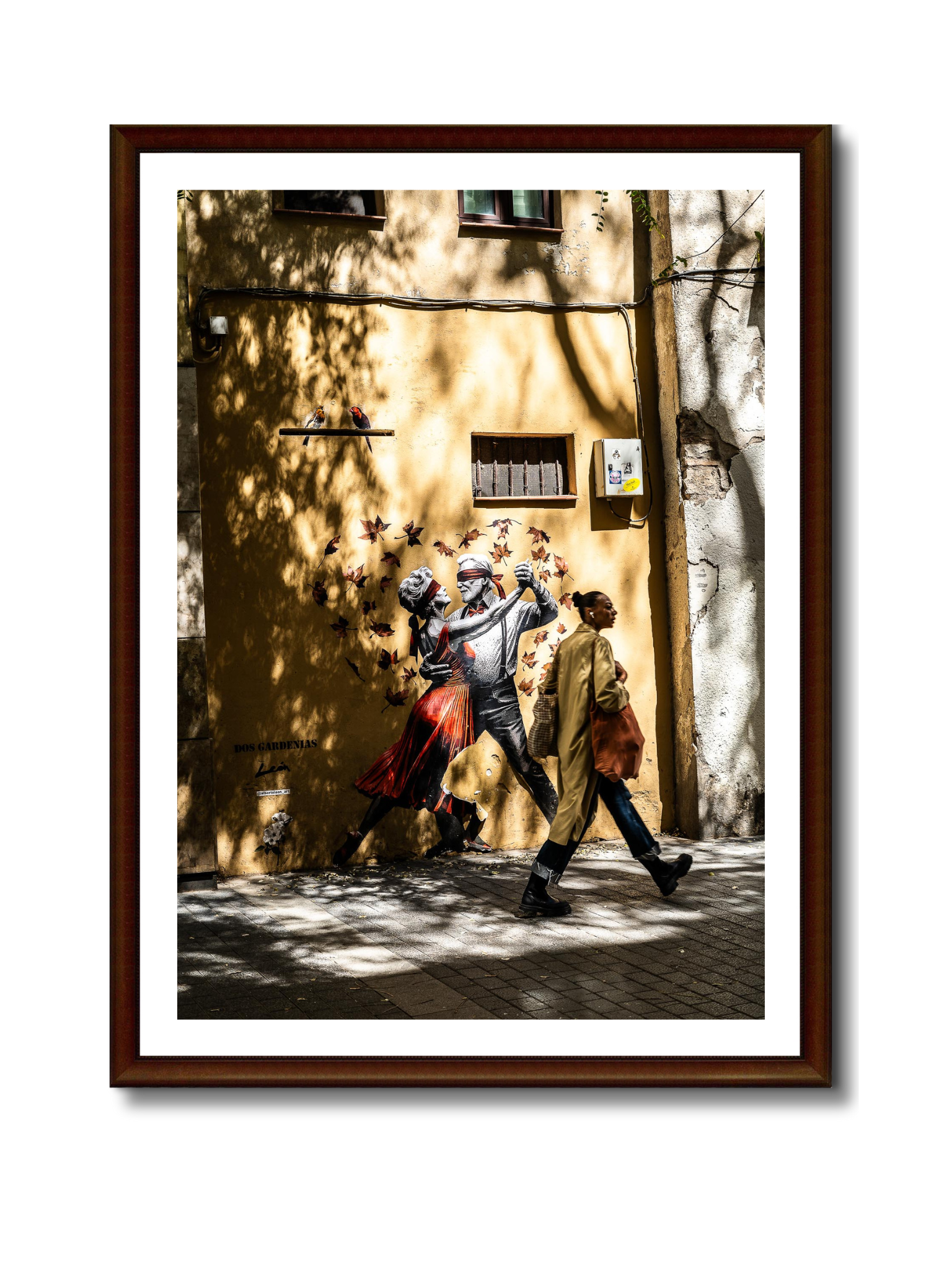 Fotografía del mural “Dos Gardenias” en el barrio de El Born, Barcelona. La escena muestra a una persona caminando frente a la obra de arte urbano que representa a una pareja bailando. Una imagen ideal para amantes de la fotografía urbana y contemporánea.