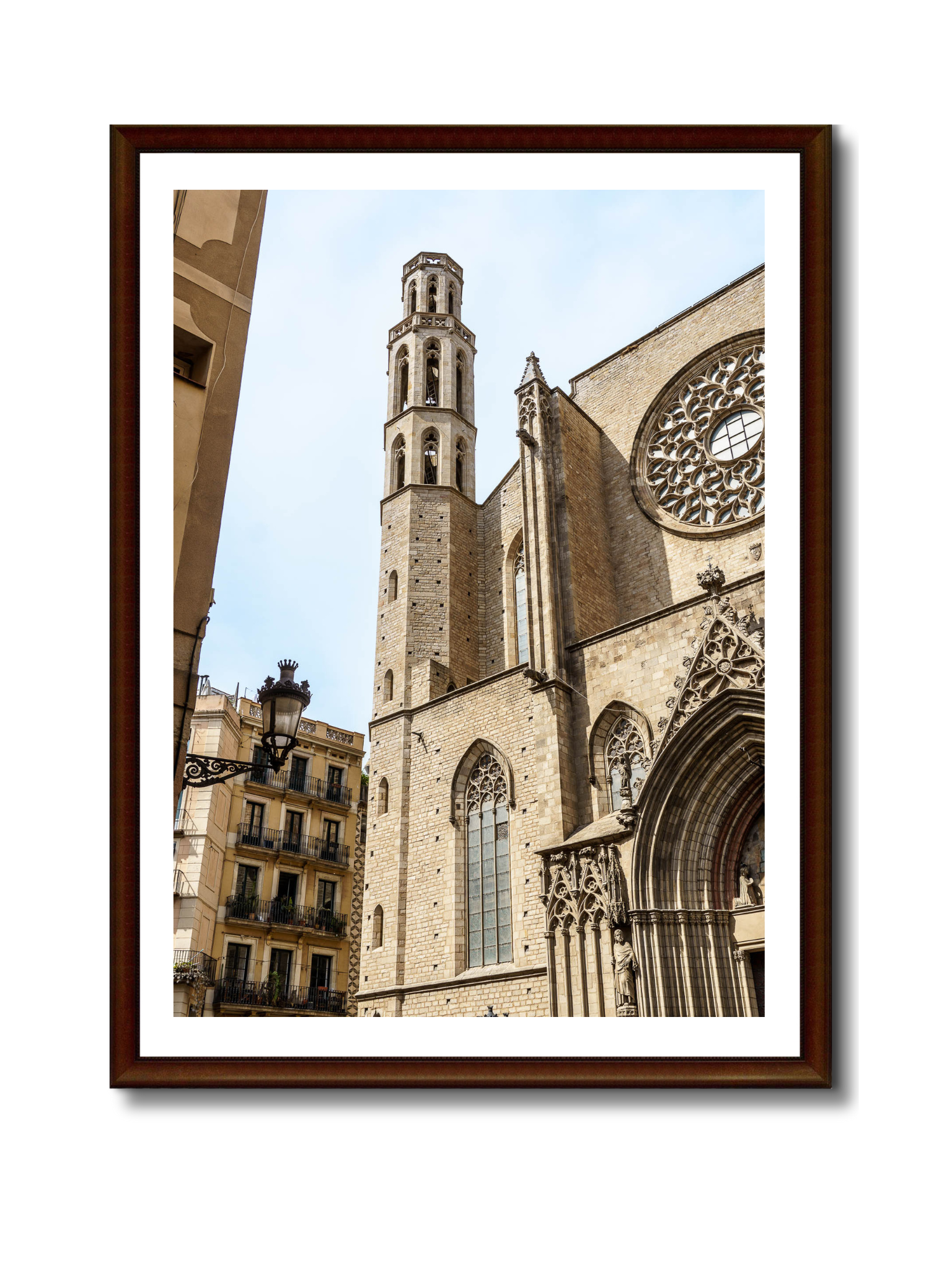 Fotografía de la basílica gótica de Santa María del Mar, situada en el barrio del Born, Barcelona. Su fachada medieval y la imponente torre campanario destacan en esta imagen que combina arquitectura histórica y vida urbana. Un símbolo cultural e histórico de la ciudad, ideal para decoración y amantes de la fotografía arquitectónica.