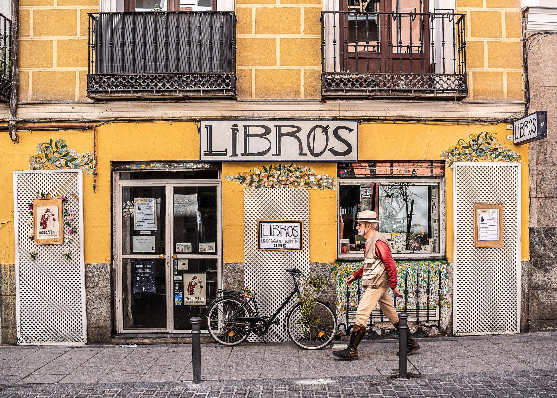 Fotografía de una librería tradicional en el barrio de malasaña en Madrid, con fachada amarilla y letrero clásico. La escena captura a un hombre caminando frente a la tienda con una bicicleta apoyada en la entrada, transmitiendo el encanto cotidiano y auténtico de la ciudad. Una lámina ideal para los amantes de la lectura, la arquitectura urbana y el espíritu madrileño.