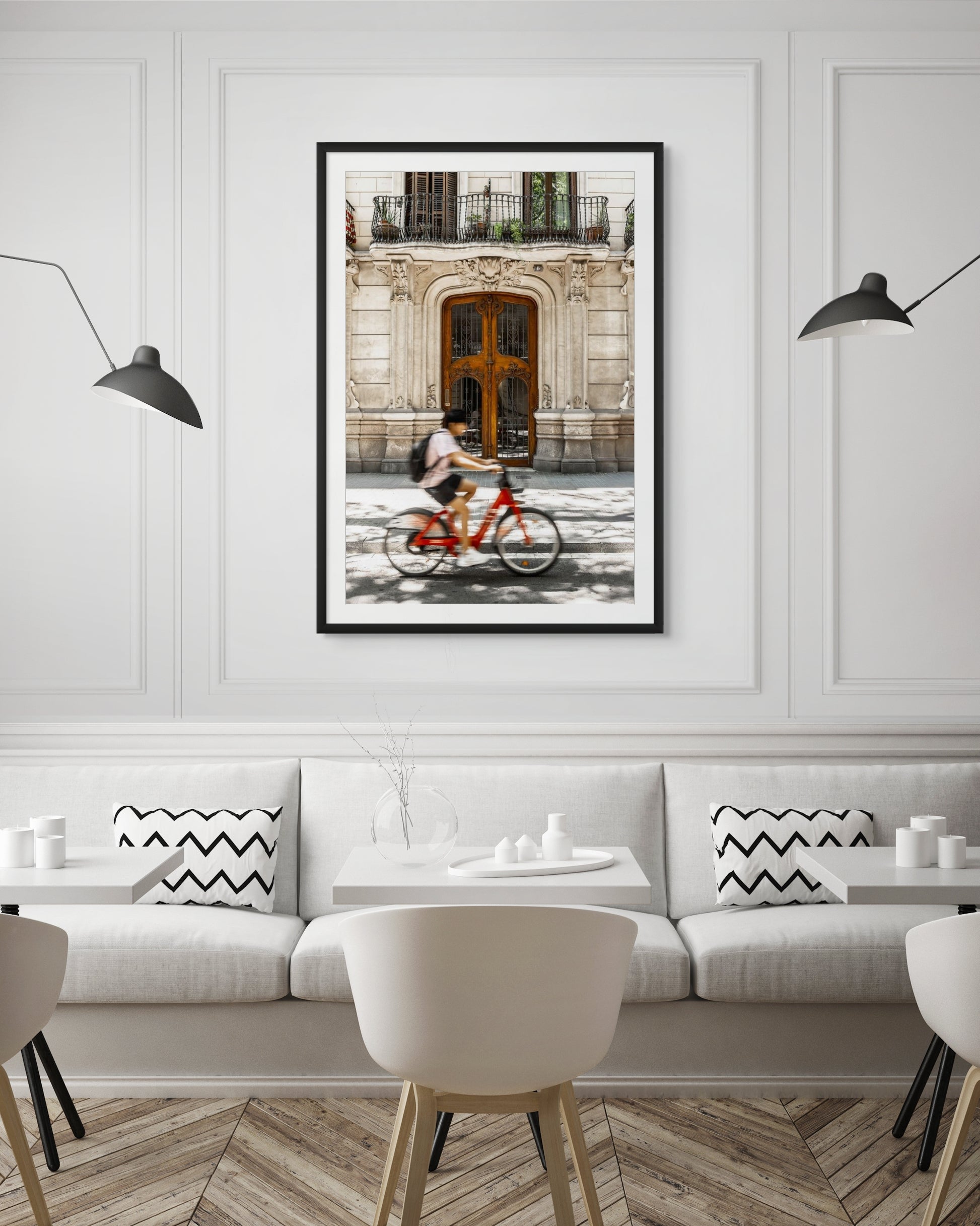 Fotografía de una puerta modernista en Barcelona, con detalles ornamentales en piedra y madera, captada con el paso de un ciclista en bicicleta roja que aporta dinamismo a la escena. Una imagen que mezcla arquitectura histórica con vida urbana contemporánea, reflejando el ritmo vibrante de la ciudad.
