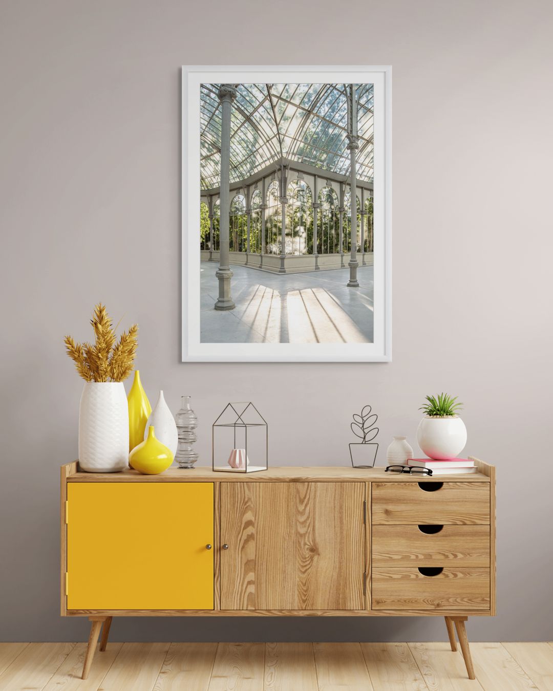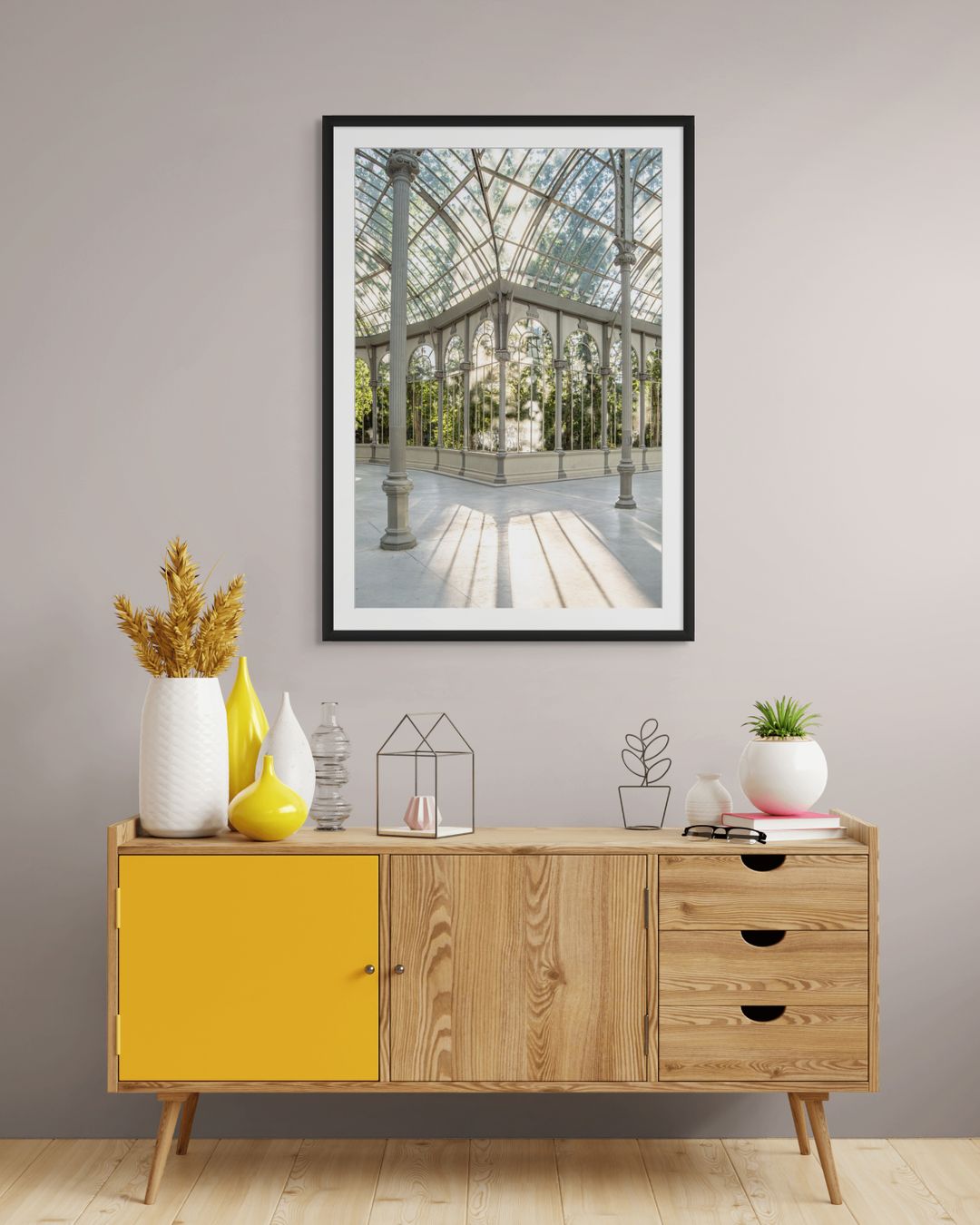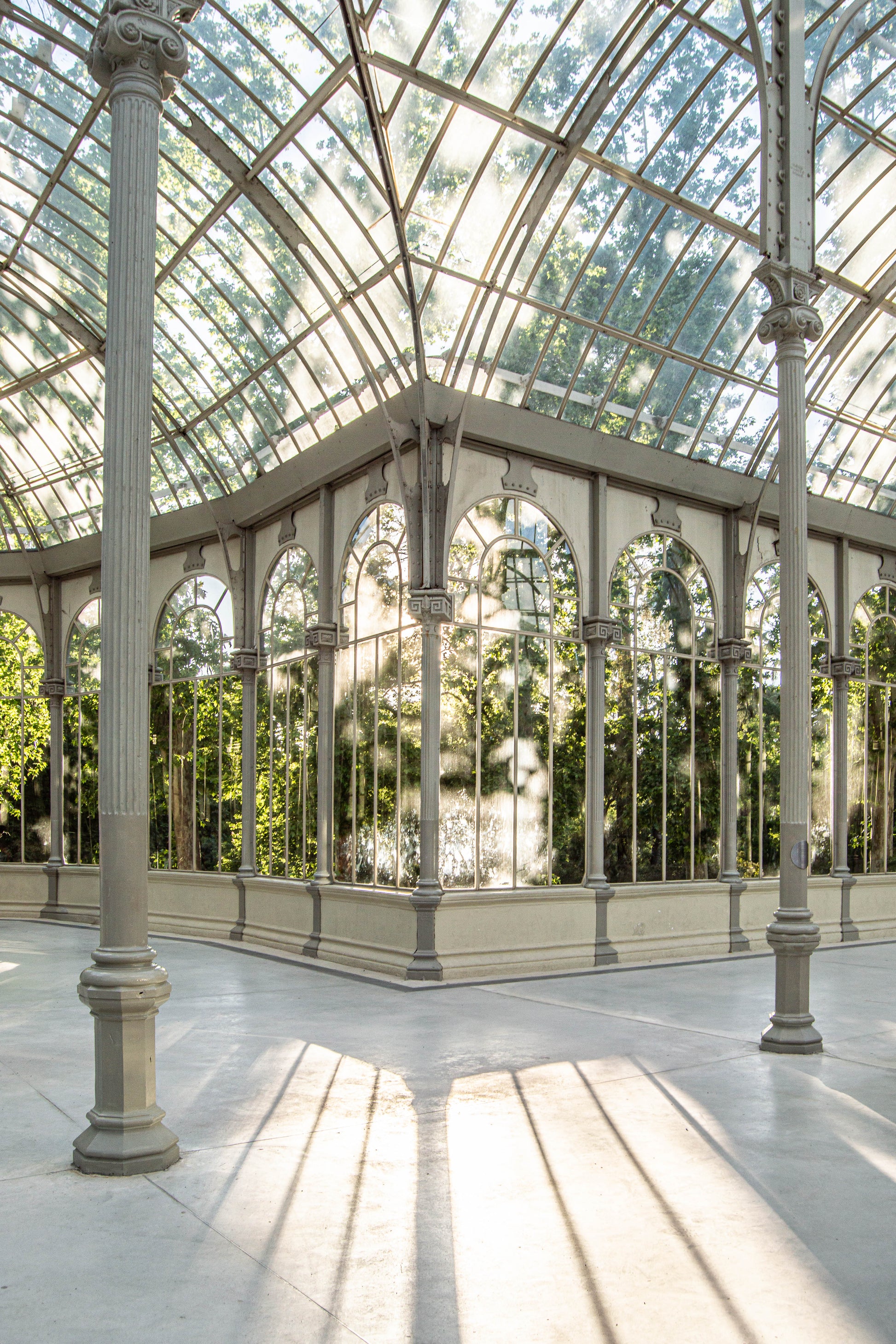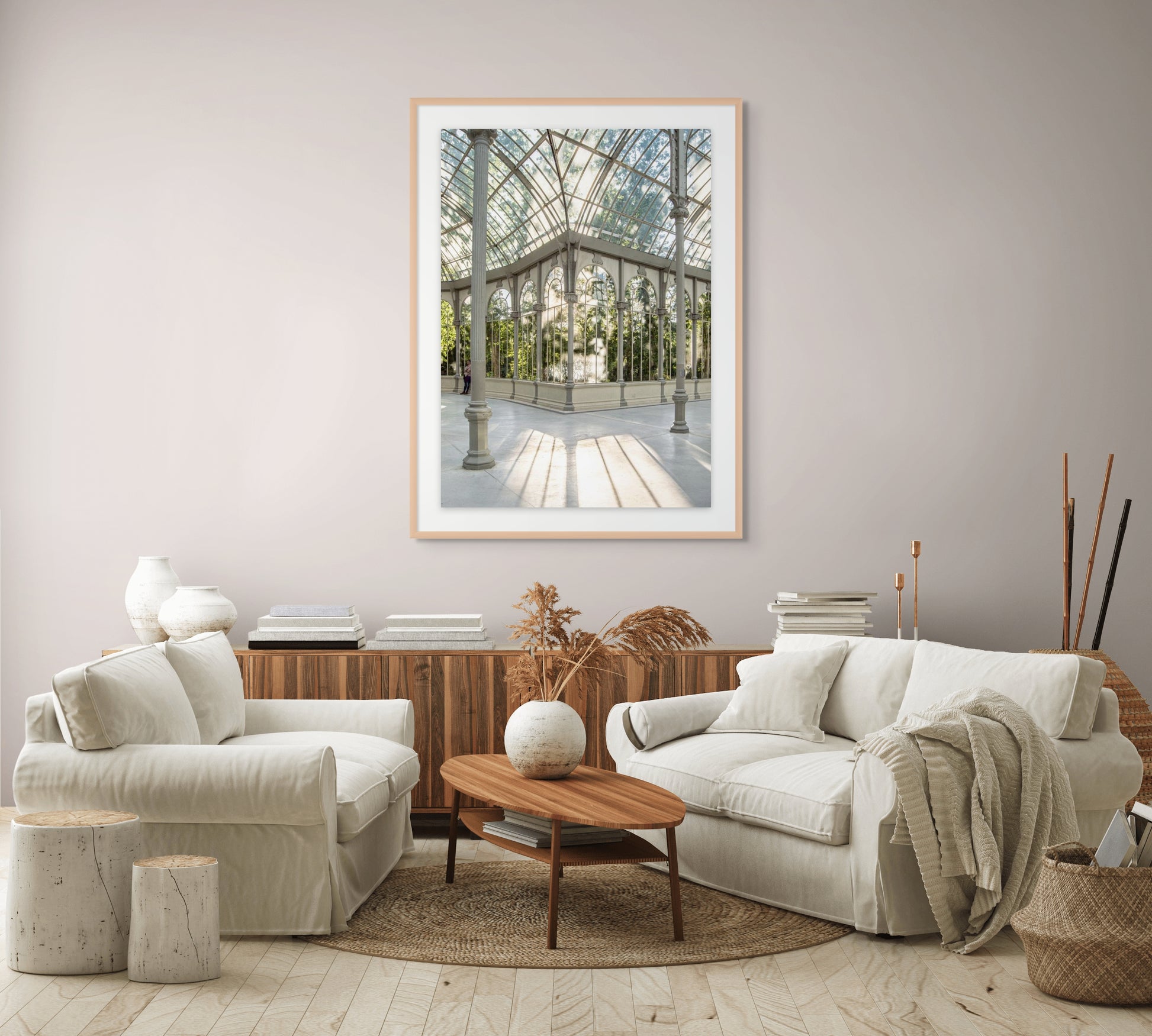 Fotografía del interior del Palacio de Cristal del Retiro en Madrid, donde la luz del atardecer atraviesa las columnas de hierro y las paredes de cristal, proyectando sombras y reflejos únicos. Una imagen minimalista y elegante que transmite calma y belleza arquitectónica, ideal para decorar hogares o espacios modernos.