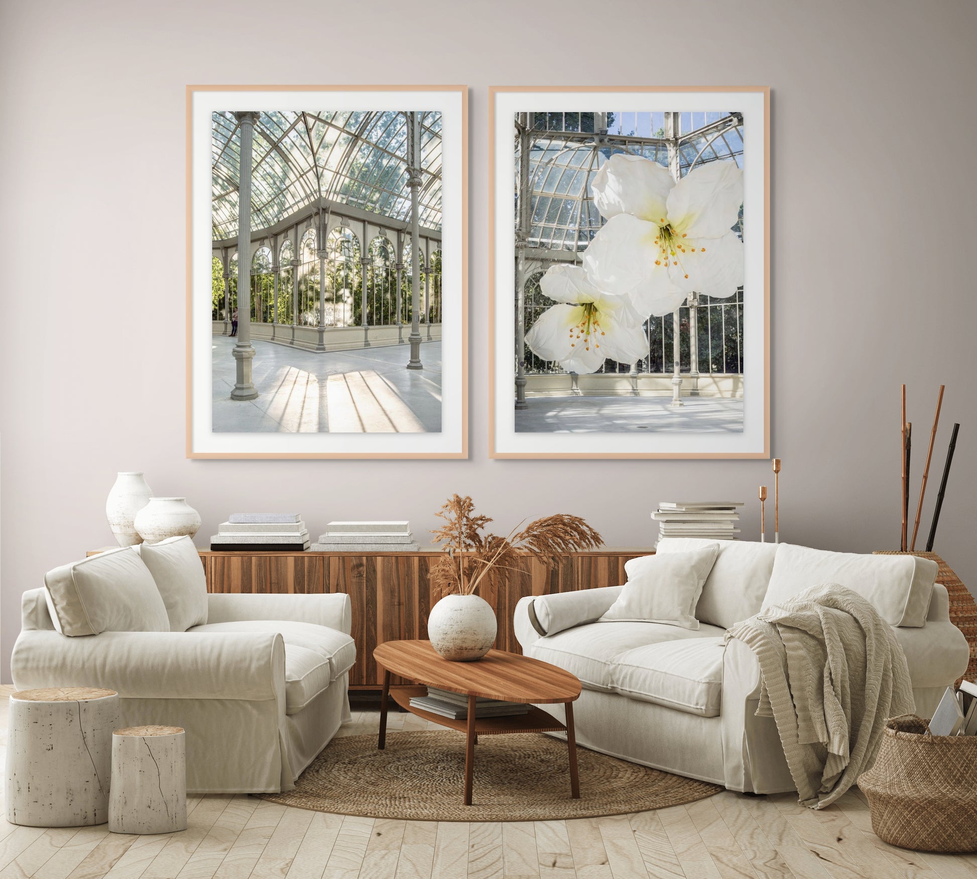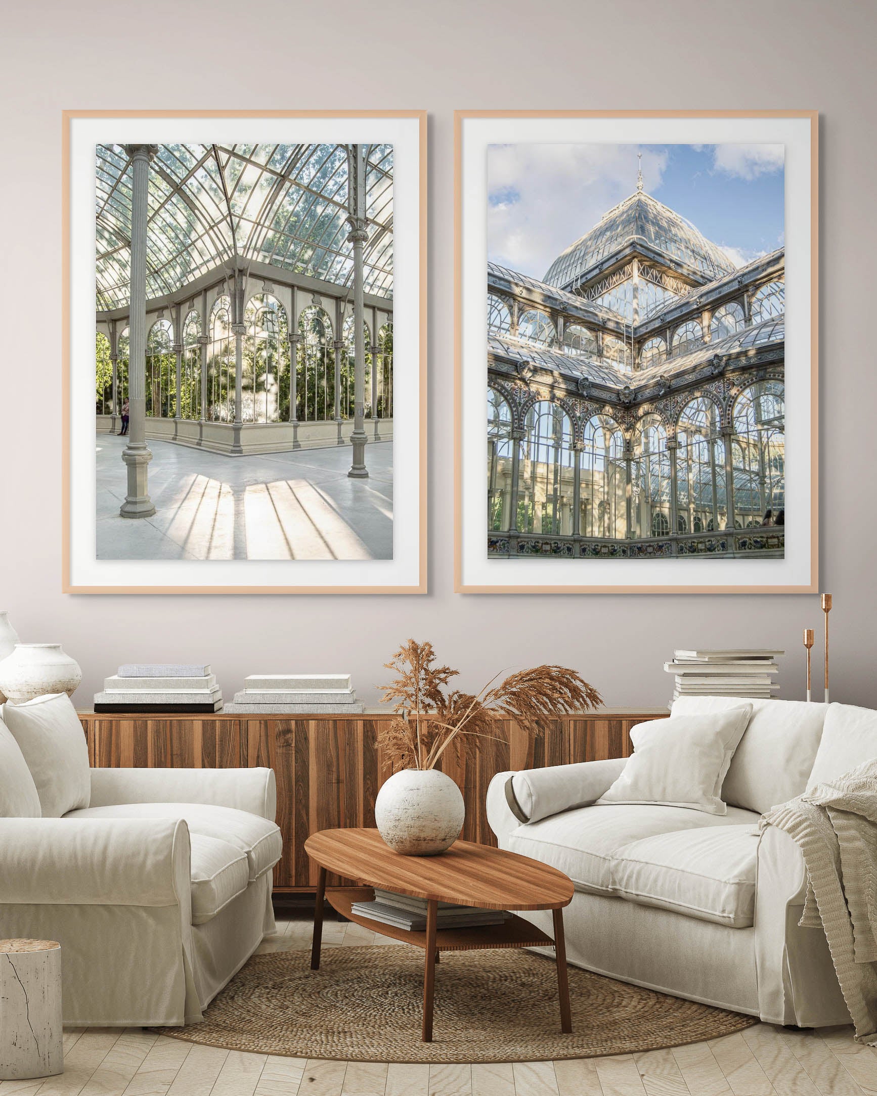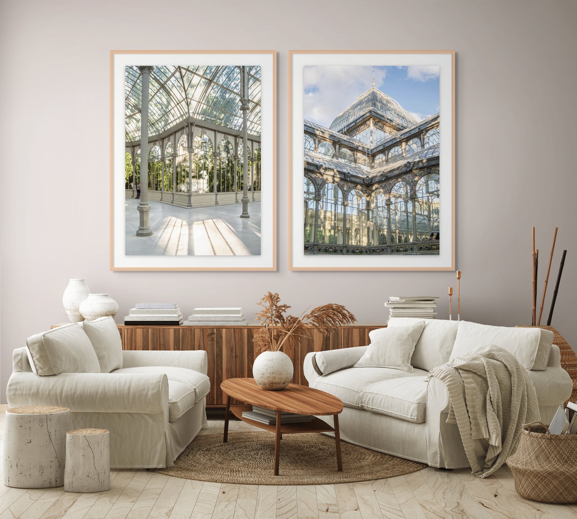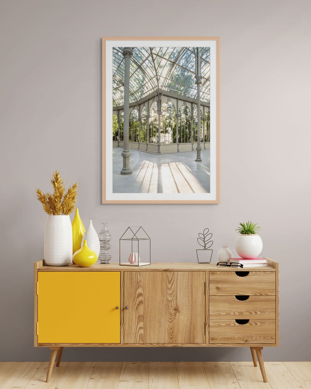 Fotografía del interior del Palacio de Cristal del Retiro en Madrid, donde la luz del atardecer atraviesa las columnas de hierro y las paredes de cristal, proyectando sombras y reflejos únicos. Una imagen minimalista y elegante que transmite calma y belleza arquitectónica, ideal para decorar hogares o espacios modernos.