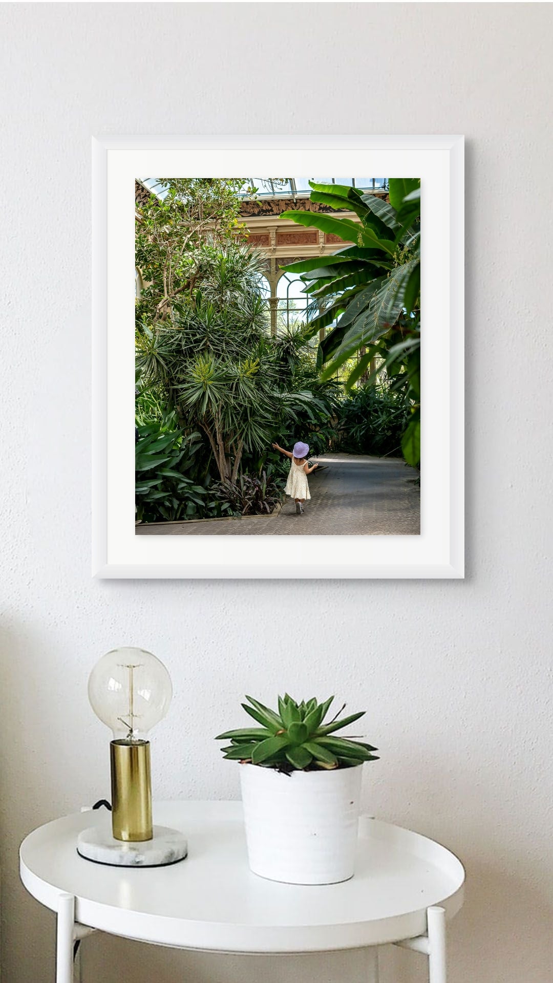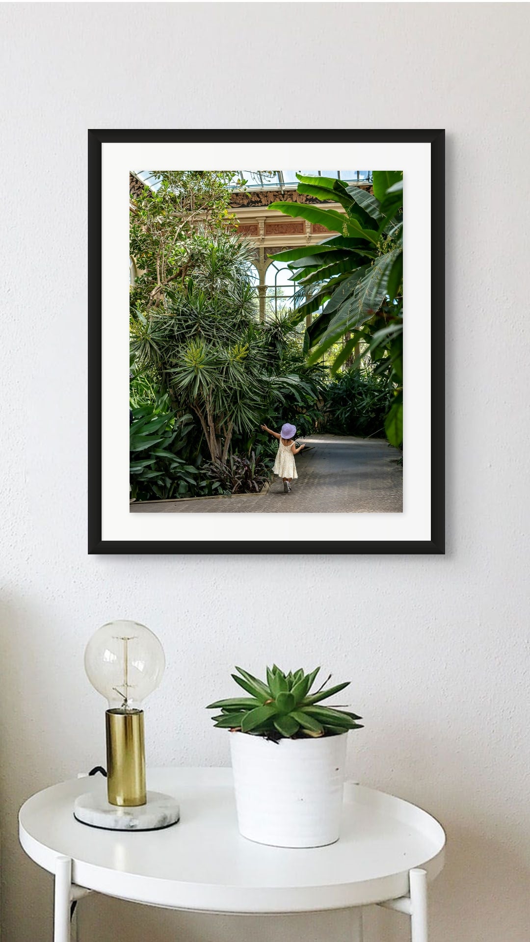 Fotografía del interior de un invernadero modernista en Barcelona. Una niña con sombrero lila y vestido claro camina entre la vegetación tropical, rodeada de hojas exuberantes y la luz que entra por los ventanales. Una imagen que transmite calma, libertad y conexión con la naturaleza, ideal para decoración artística y fotografía contemporánea.