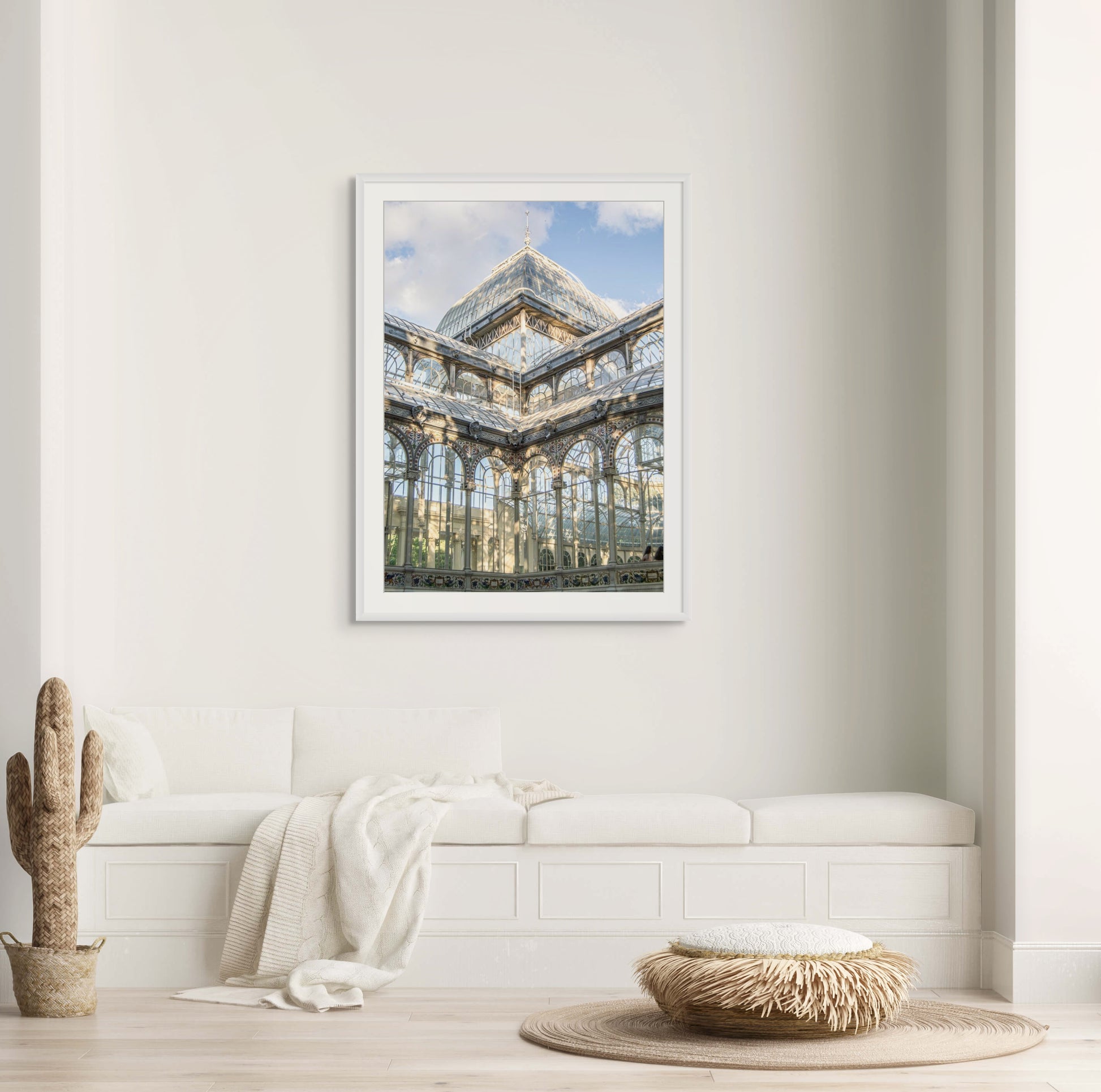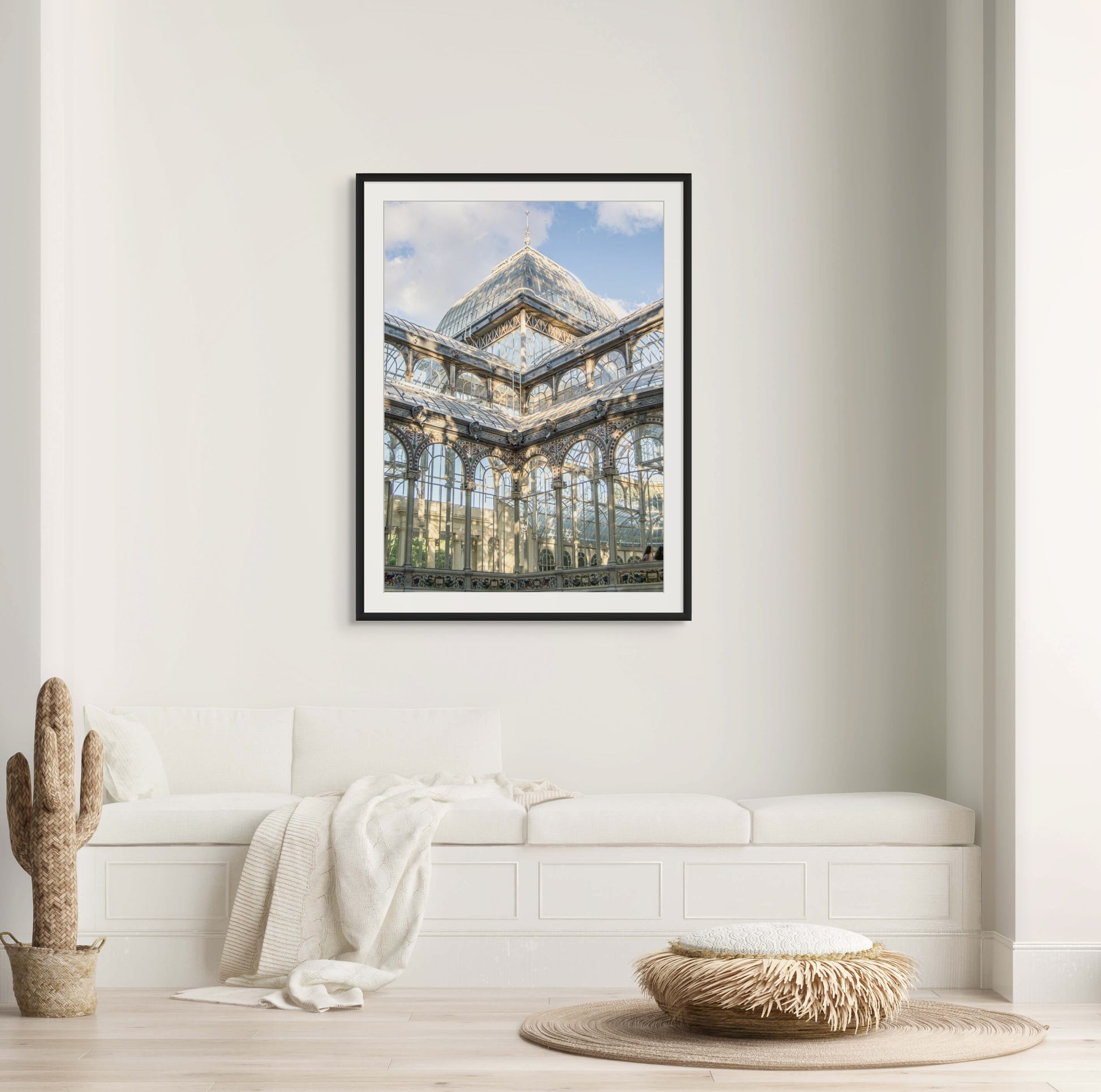 Fotografía del Palacio de Cristal en el Parque del Retiro, Madrid. La imagen resalta la arquitectura de hierro y cristal con sus reflejos y detalles ornamentales, bajo una luz suave de tarde. Una pieza elegante y luminosa, ideal para decoración de interiores y amantes de la arquitectura madrileña.