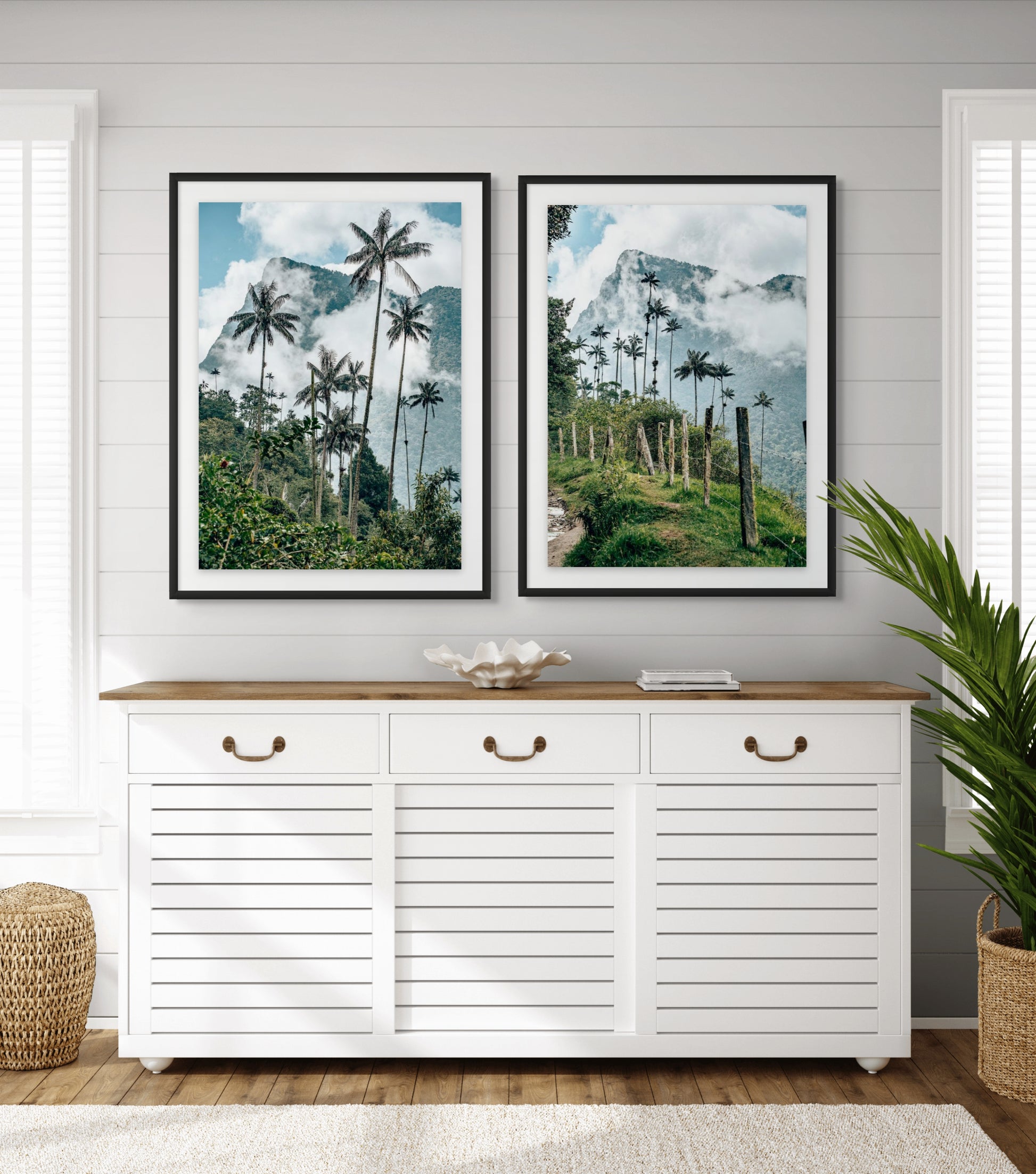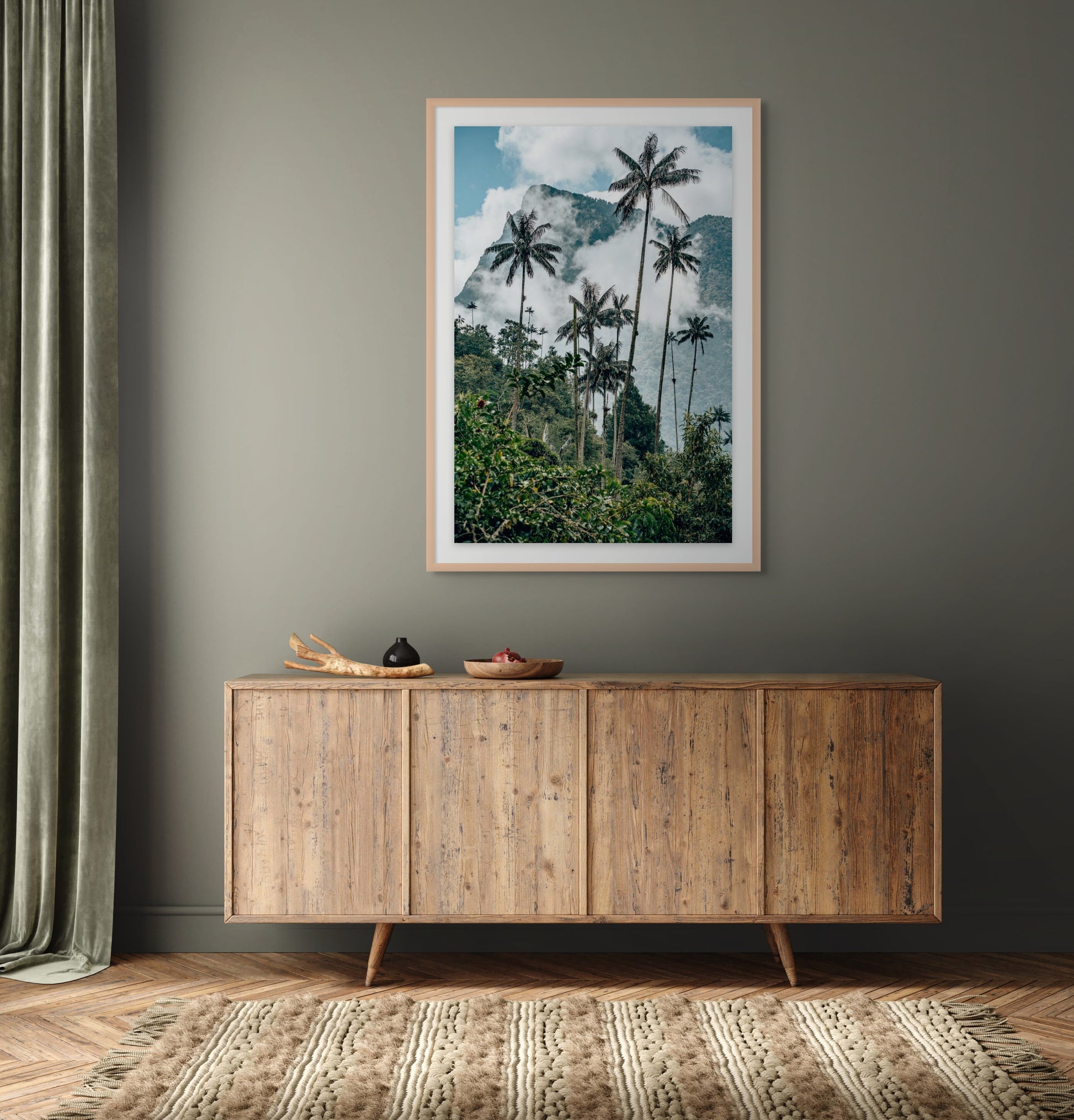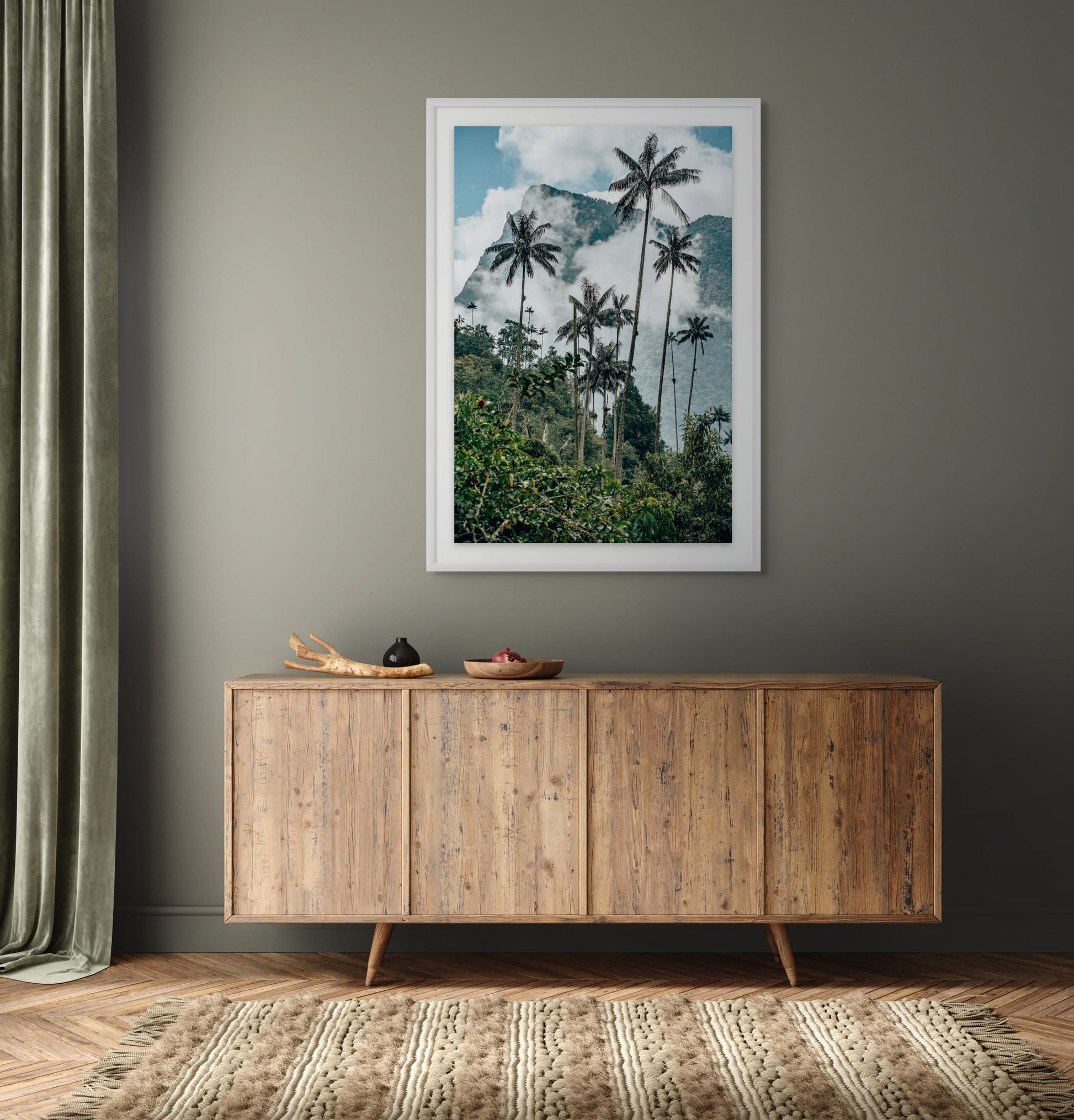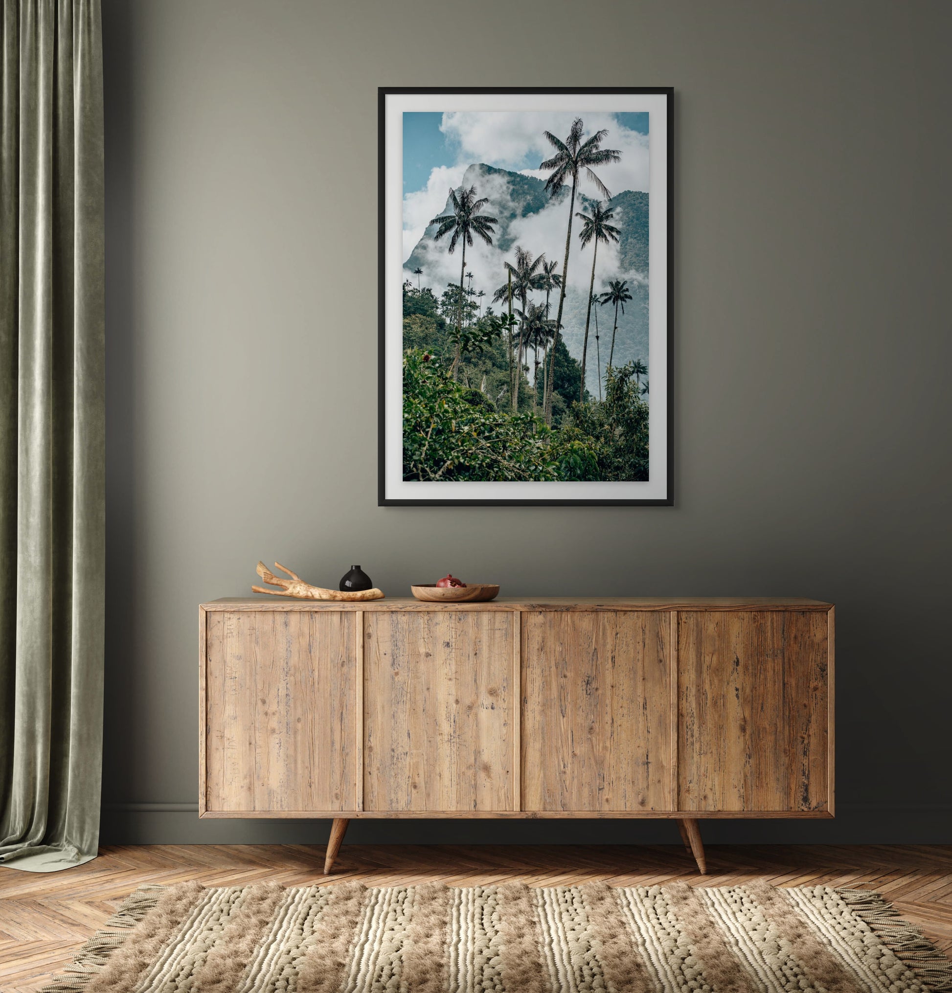 Fotografía del Valle de Cocora, en Colombia, donde se alzan las imponentes palmas de cera, el árbol nacional del país. La niebla rodea las montañas creando una atmósfera mística y única en este paisaje natural de los Andes colombianos. Una imagen que transmite la grandeza de la naturaleza y la belleza del entorno tropical.