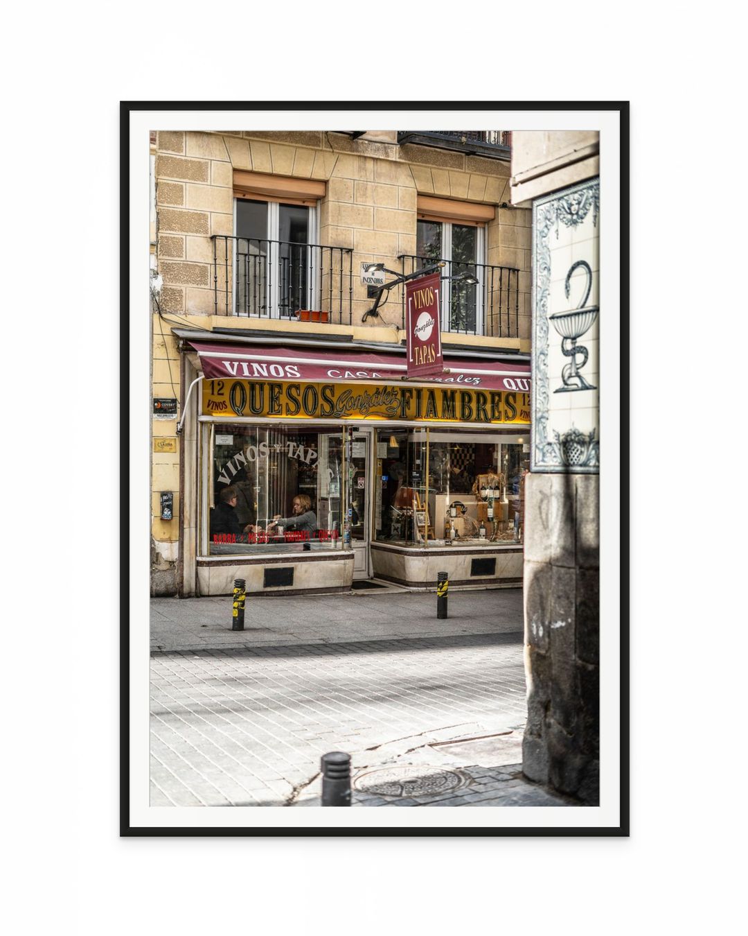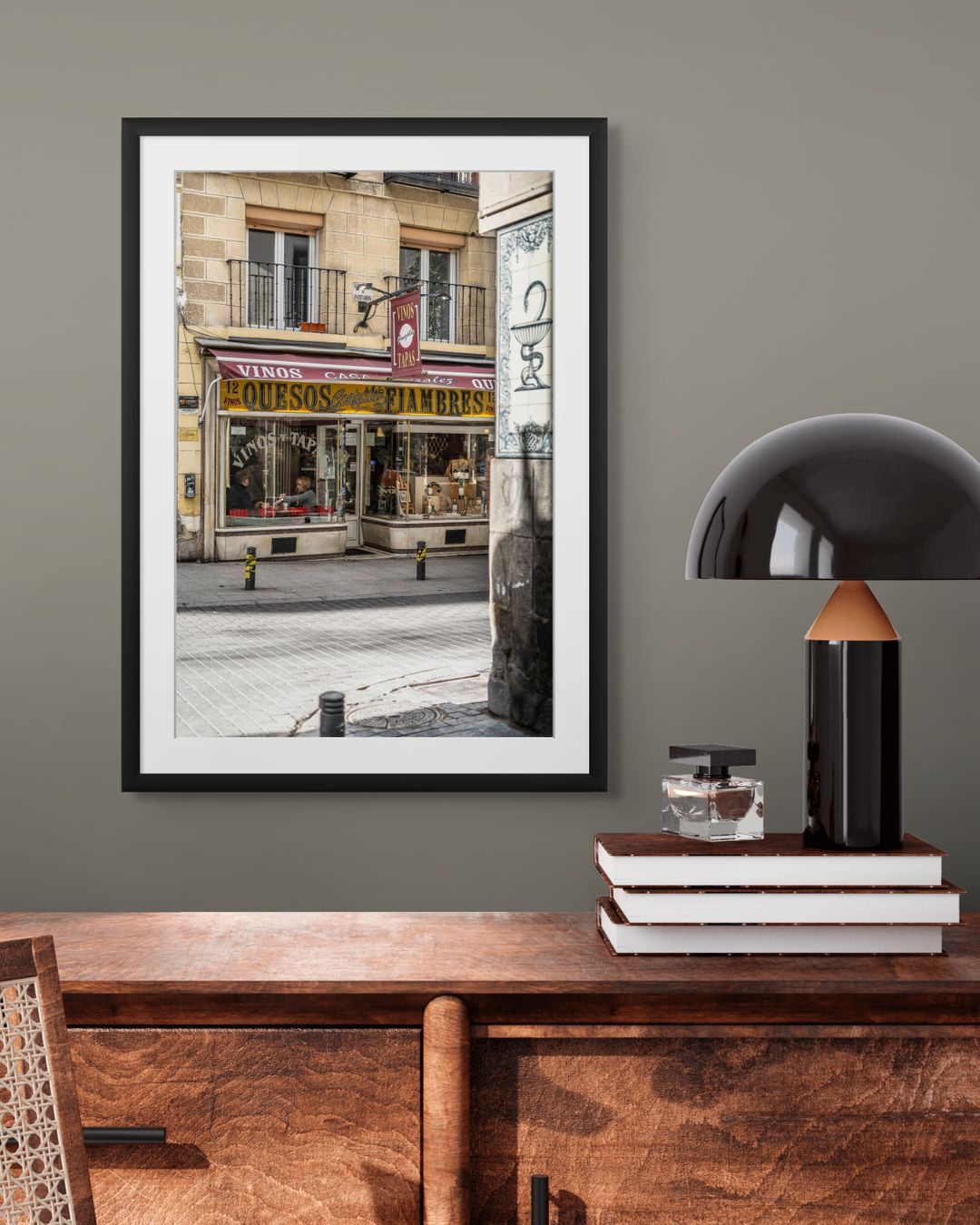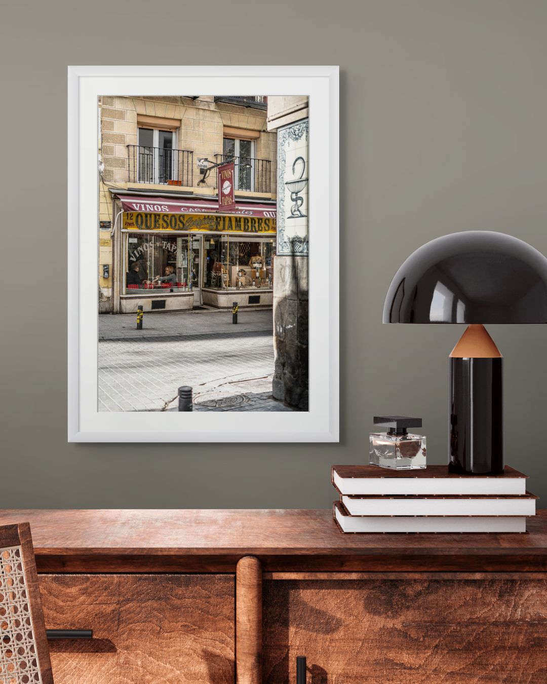 Fotografía tomada en el corazón del Barrio de las Letras, en Madrid. La fachada de una tradicional tienda de quesos y fiambres que conserva el encanto de los comercios de toda la vida. Los tonos cálidos y la luz natural resaltan los detalles del escaparate, evocando la esencia del Madrid más auténtico.