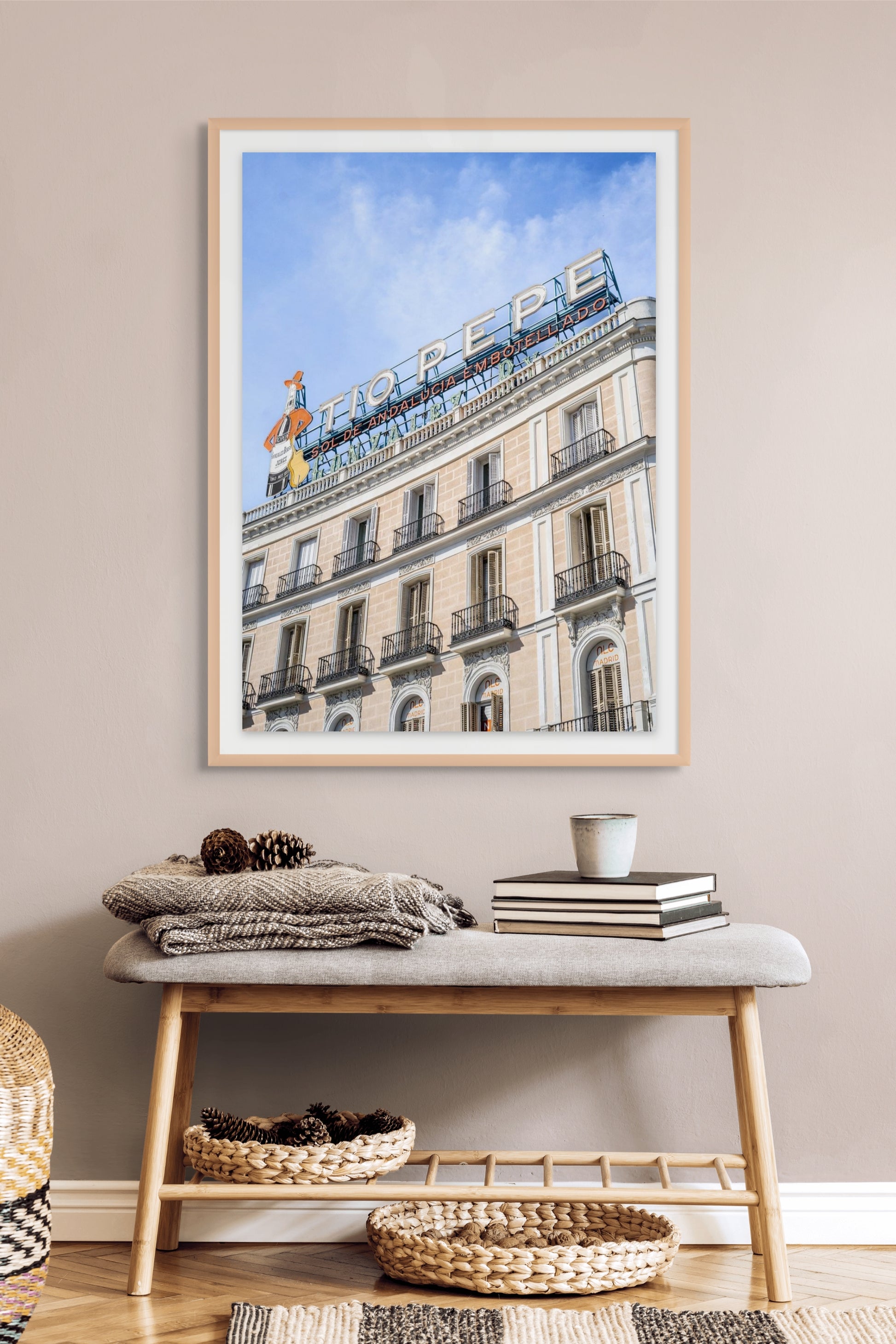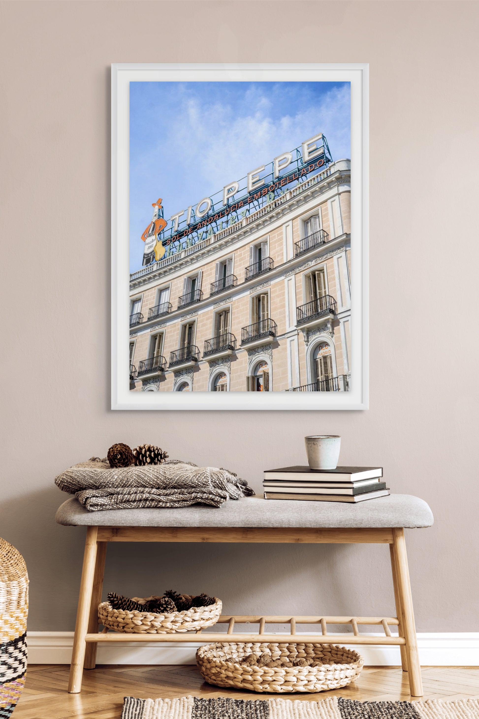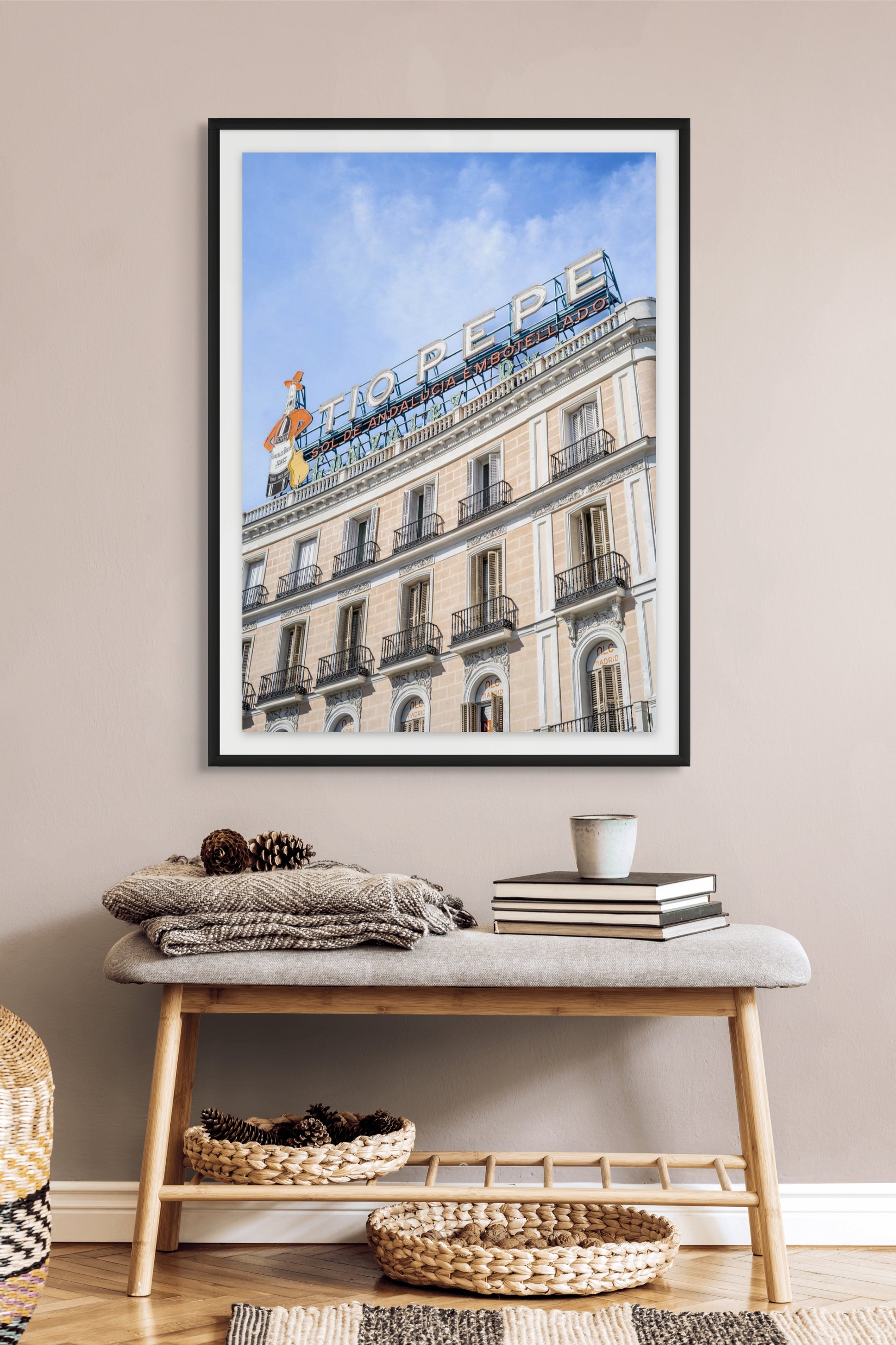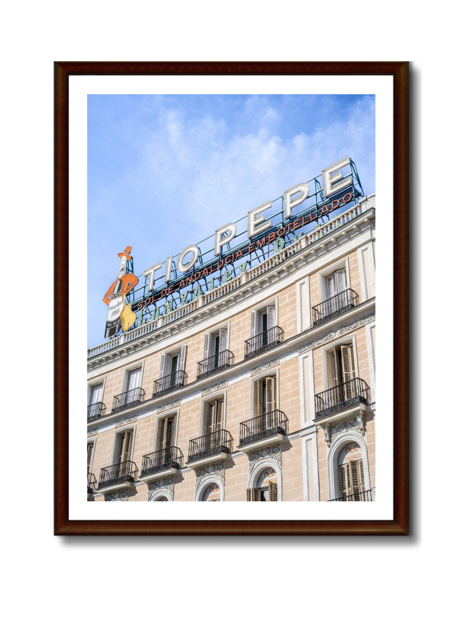 Fotografía del mítico rótulo luminoso de Tío Pepe en la Puerta del Sol, Madrid. Un símbolo de la ciudad y uno de sus emblemas más reconocidos, que forma parte de la memoria colectiva madrileña. Ideal para quienes buscan una lámina decorativa con un icono clásico de Madrid y su cultura popular.